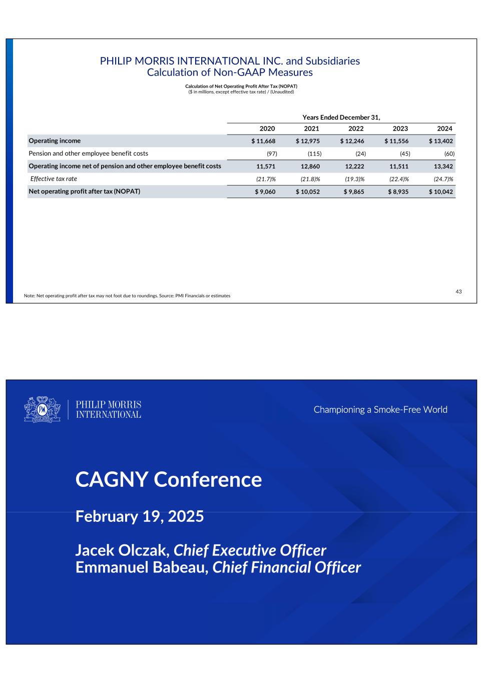 43 PHILIP MORRIS INTERNATIONAL INC. and Subsidiaries Calculation of Non-GAAP Measures Calculation of Net Operating Profit After Tax (NOPAT) ($ in millions, except effective tax rate) / (Unaudited) Note: Net operating profit after tax may not foot due to roundings. Source: PMI Financials or estimates 2020 2021 2022 2023 2024 Operating income $ 11,668 $ 12,975 $ 12,246 $ 11,556 $ 13,402 Pension and other employee benefit costs (97) (115) (24) (45) (60) Operating income net of pension and other employee benefit costs 11,571 12,860 12,222 11,511 13,342 Effective tax rate (21.7)% (21.8)% (19.3)% (22.4)% (24.7)% Net operating profit after tax (NOPAT) $ 9,060 $ 10,052 $ 9,865 $ 8,935 $ 10,042 Years Ended December 31, Championing a Smoke-Free World CAGNY Conference February 19, 2025 Jacek Olczak, Chief Executive Officer Emmanuel Babeau, Chief Financial Officer