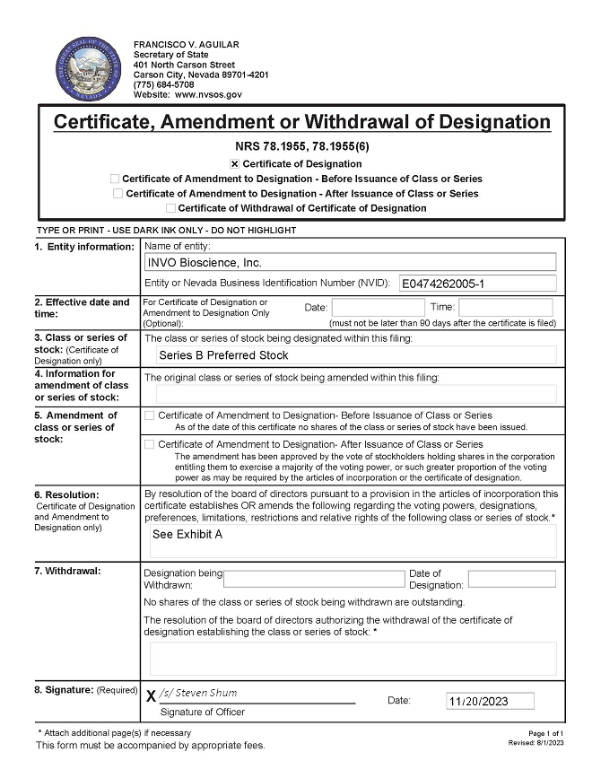 Reference is made to the Certificate of Designations of the Series B Preferred Stock of INVO Bioscience, Inc. (the “Certificate of Designations”). In accordance with and pursuant to the Certificate of Designations, the undersigned hereby elects to convert the number of shares of Series B Preferred Stock, $0.0001 par value per share (the “Preferred Shares”), of INVO Bioscience, Inc., a Nevada corporation (the “Corporation”), indicated below into shares of common stock, $0.0001 value per share (the “Common Stock”), of the Corporation, as of the date specified below.