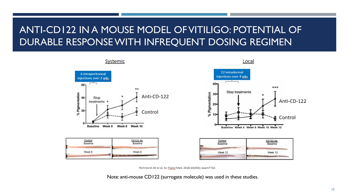 ANTI-CD122 IN A MOUSE MODEL OF VITILIGO: POTENTIAL OF DURABLE RESPONSE WITH INFREQUENT DOSING REGIMEN Note: anti-mouse CD122 (surrogate molecule) was used in these studies. 10
