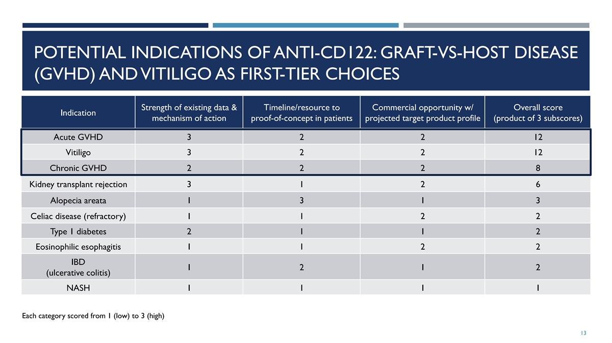 POTENTIAL INDICATIONS OF ANTI-CD122: GRAFT-VS-HOST DISEASE (GVHD) AND VITILIGO AS FIRST-TIER CHOICES Strength of existing data & Timeline/resource to Commercial opportunity w/ Overall score Indication mechanism of action proof-of-concept in patients projected target product profile (product of 3 subscores) Acute GVHD 3 2 2 12 Vitiligo 3 2 2 12 Chronic GVHD 2 2 2 8 Kidney transplant rejection 3 1 2 6 Alopecia areata 1 3 1 3 Celiac disease (refractory) 1 1 2 2 Type 1 diabetes 2 1 1 2 Eosinophilic esophagitis 1 1 2 2 IBD 1 2 1 2 (ulcerative colitis) NASH 1 1 1 1 Each category scored from 1 (low) to 3 (high) 13