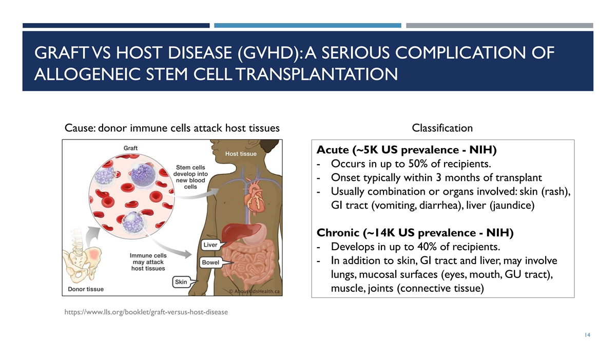 GRAFT VS HOST DISEASE (GVHD): A SERIOUS COMPLICATION OF ALLOGENEIC STEM CELL TRANSPLANTATION Cause: donor immune cells attack host tissues Classification Acute (~5K US prevalence - NIH) - Occurs in up to 50% of recipients. - Onset typically within 3 months of transplant - Usually combination or organs involved: skin (rash), GI tract (vomiting, diarrhea), liver (jaundice) Chronic (~14K US prevalence - NIH) - Develops in up to 40% of recipients. - In addition to skin, GI tract and liver, may involve lungs, mucosal surfaces (eyes, mouth, GU tract), muscle, joints (connective tissue) https://www.lls.org/booklet/graft-versus-host-disease 14