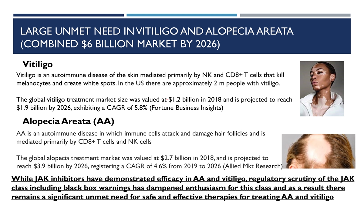 LARGE UNMET NEED IN VITILIGO AND ALOPECIA AREATA (COMBINED $6 BILLION MARKET BY 2026) Vitiligo Vitiligo is an autoimmune disease of the skin mediated primarily by NK and CD8+ T cells that kill melanocytes and create white spots. In the US there are approximately 2 m people with vitiligo. The global vitiligo treatment market size was valued at $1.2 billion in 2018 and is projected to reach $1.9 billion by 2026, exhibiting a CAGR of 5.8% (Fortune Business Insights) Alopecia Areata (AA) AA is an autoimmune disease in which immune cells attack and damage hair follicles and is mediated primarily by CD8+ T cells and NK cells The global alopecia treatment market was valued at $2.7 billion in 2018, and is projected to reach $3.9 billion by 2026, registering a CAGR of 4.6% from 2019 to 2026 (Allied Mkt Research) While JAK inhibitors have demonstrated efficacy in AA and vitiligo, regulatory scrutiny of the JAK class including black box warnings has dampened enthusiasm for this class and as a result there remains a significant unmet need for safe and effective therapies for treating AA and vitiligo