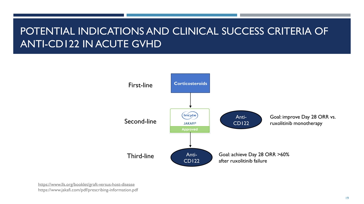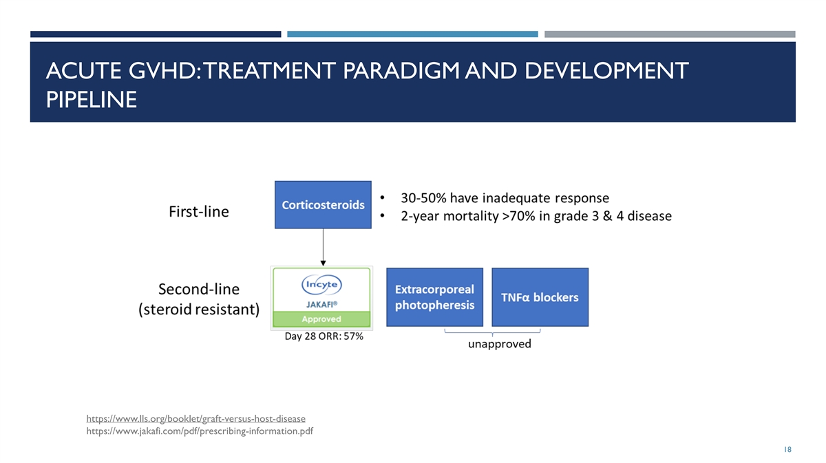 ACUTE GVHD: TREATMENT PARADIGM AND DEVELOPMENT PIPELINE https://www.lls.org/booklet/graft-versus-host-disease https://www.jakafi.com/pdf/prescribing-information.pdf 18