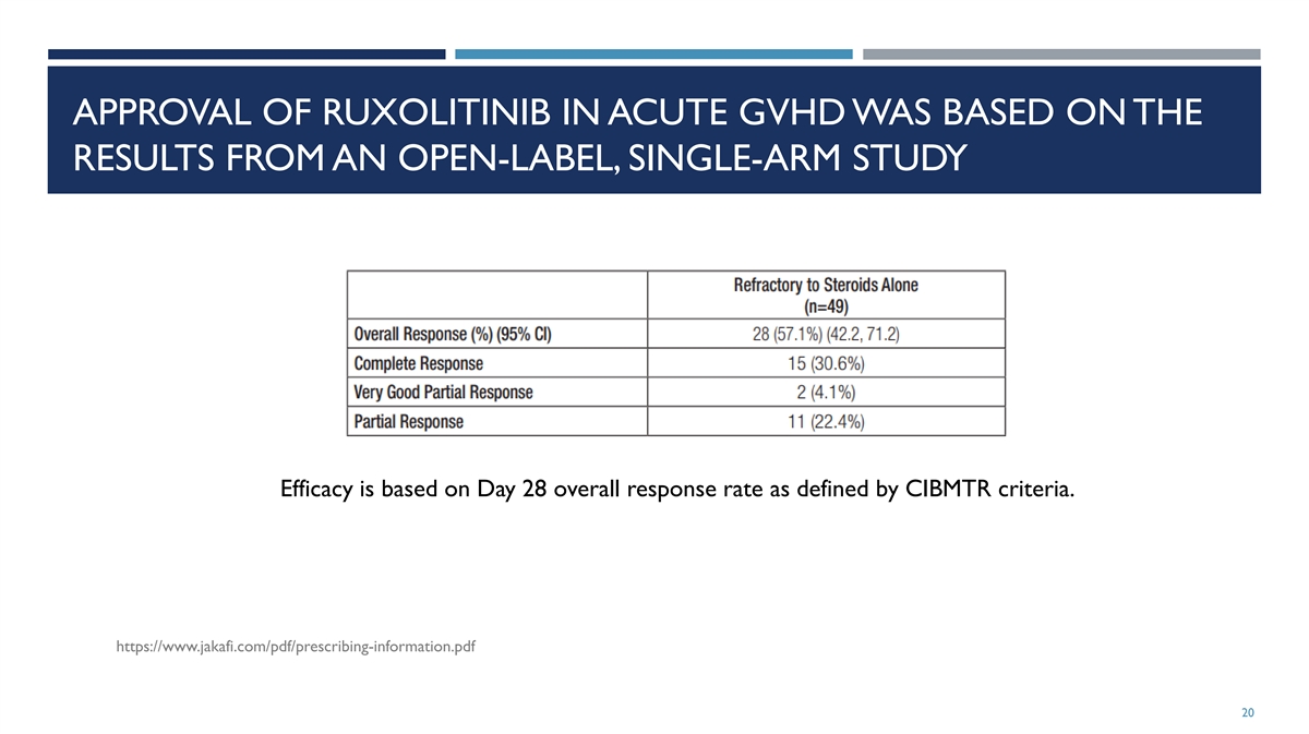 APPROVAL OF RUXOLITINIB IN ACUTE GVHD WAS BASED ON THE RESULTS FROM AN OPEN-LABEL, SINGLE-ARM STUDY Efficacy is based on Day 28 overall response rate as defined by CIBMTR criteria. https://www.jakafi.com/pdf/prescribing-information.pdf 20