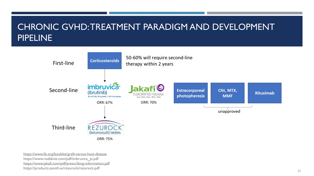CHRONIC GVHD: TREATMENT PARADIGM AND DEVELOPMENT PIPELINE https://www.lls.org/booklet/graft-versus-host-disease https://www.rxabbvie.com/pdf/imbruvica_pi.pdf https://www.jakafi.com/pdf/prescribing-information.pdf https://products.sanofi.us/rezurock/rezurock.pdf 21