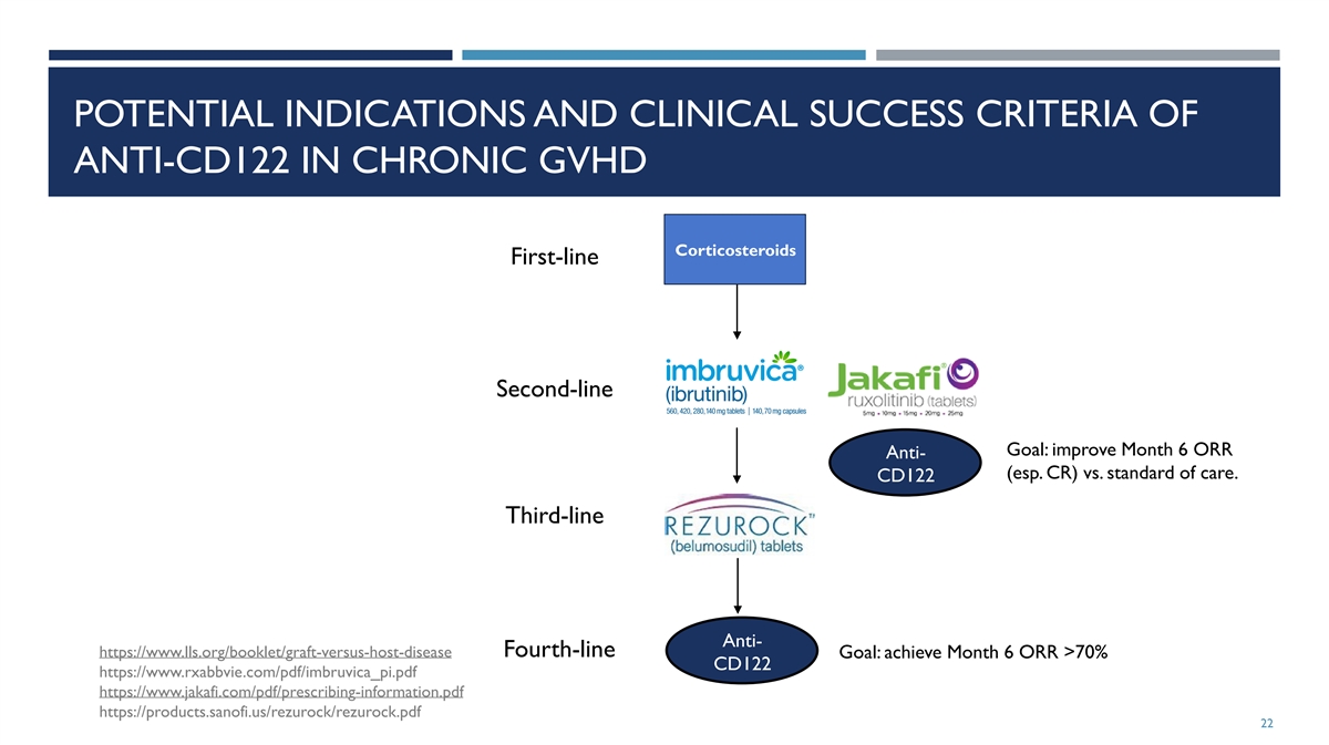 POTENTIAL INDICATIONS AND CLINICAL SUCCESS CRITERIA OF ANTI-CD122 IN CHRONIC GVHD Corticosteroids First-line Second-line Goal: improve Month 6 ORR Anti- (esp. CR) vs. standard of care. CD122 Third-line Anti- Fourth-line https://www.lls.org/booklet/graft-versus-host-disease Goal: achieve Month 6 ORR >70% CD122 https://www.rxabbvie.com/pdf/imbruvica_pi.pdf https://www.jakafi.com/pdf/prescribing-information.pdf https://products.sanofi.us/rezurock/rezurock.pdf 22