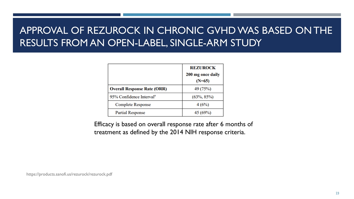 APPROVAL OF REZUROCK IN CHRONIC GVHD WAS BASED ON THE RESULTS FROM AN OPEN-LABEL, SINGLE-ARM STUDY Efficacy is based on overall response rate after 6 months of treatment as defined by the 2014 NIH response criteria. https://products.sanofi.us/rezurock/rezurock.pdf 23