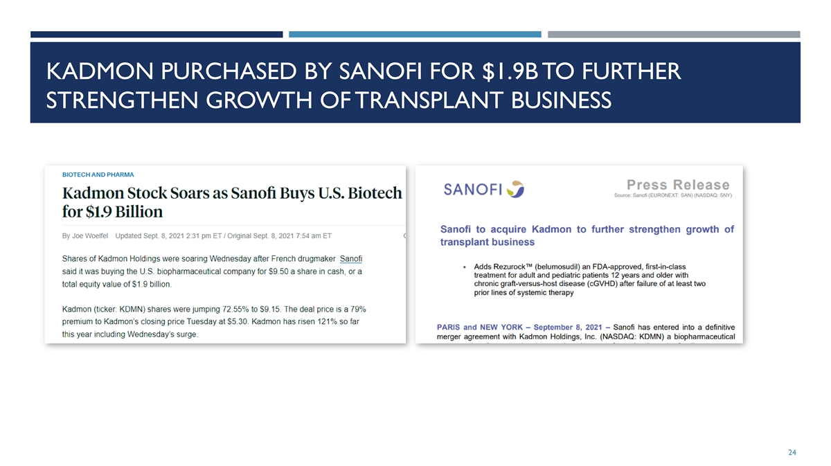 KADMON PURCHASED BY SANOFI FOR $1.9B TO FURTHER STRENGTHEN GROWTH OF TRANSPLANT BUSINESS 24