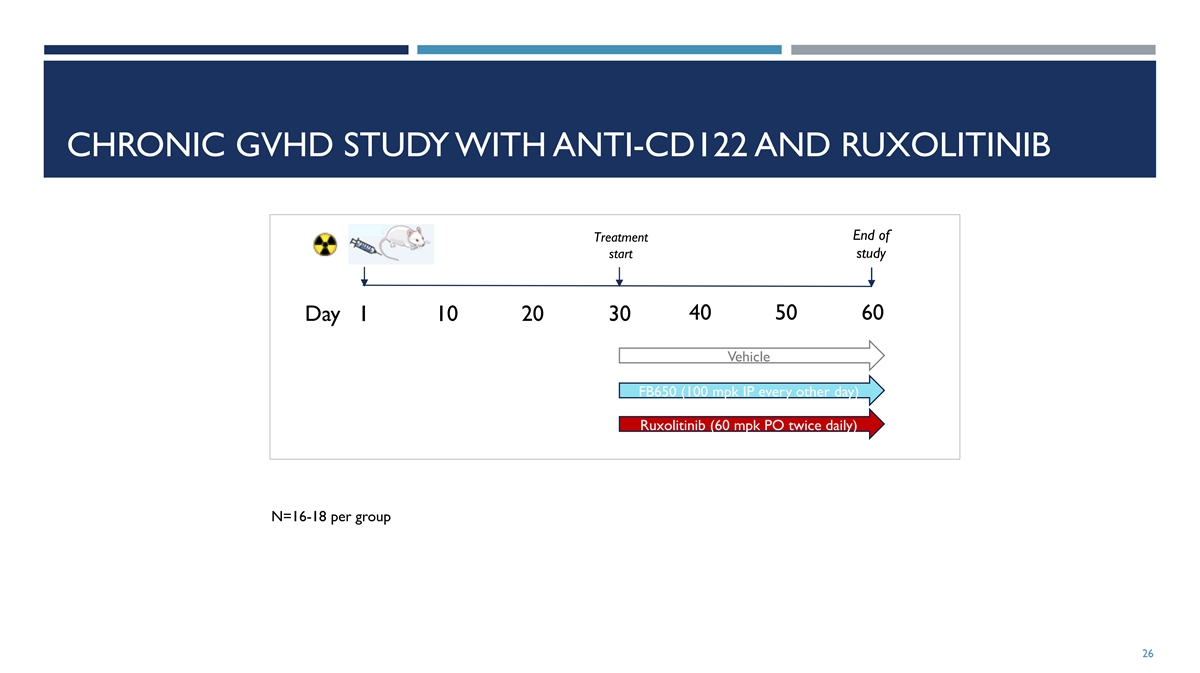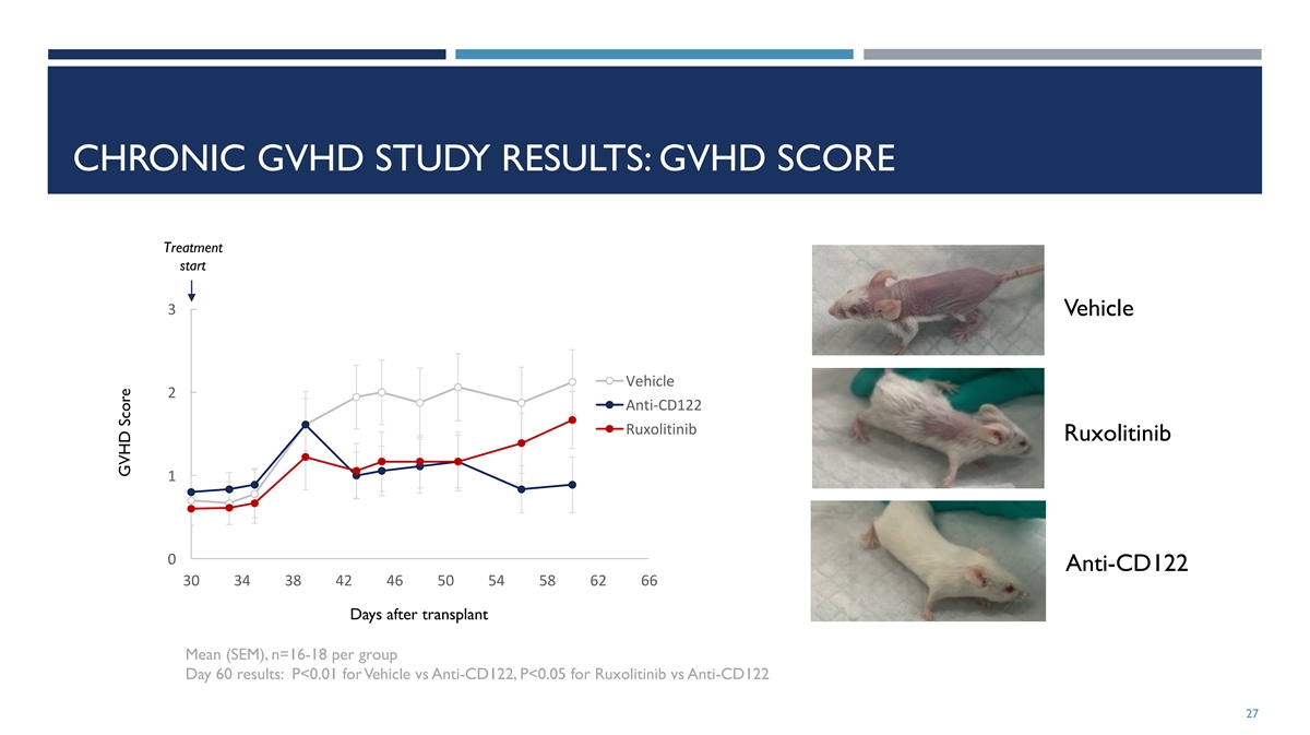 CHRONIC GVHD STUDY WITH ANTI-CD122 AND RUXOLITINIB End of Treatment start study 40 50 60 Day 1 10 20 30 Vehicle FB650 (100 mpk IP every other day) Ruxolitinib (60 mpk PO twice daily) N=16-18 per group 26