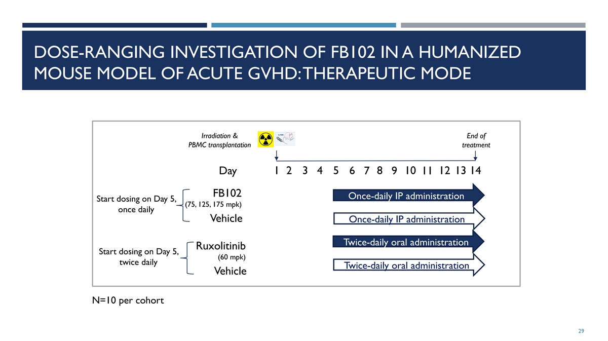 DOSE-RANGING INVESTIGATION OF FB102 IN A HUMANIZED MOUSE MODEL OF ACUTE GVHD: THERAPEUTIC MODE Irradiation & End of PBMC transplantation treatment 1 2 3 4 5 6 8 10 12 13 14 Day 7 9 11 FB102 Once-daily IP administration Start dosing on Day 5, (75, 125, 175 mpk) once daily Vehicle Once-daily IP administration Twice-daily oral administration Ruxolitinib Start dosing on Day 5, (60 mpk) twice daily Twice-daily oral administration Vehicle N=10 per cohort 29