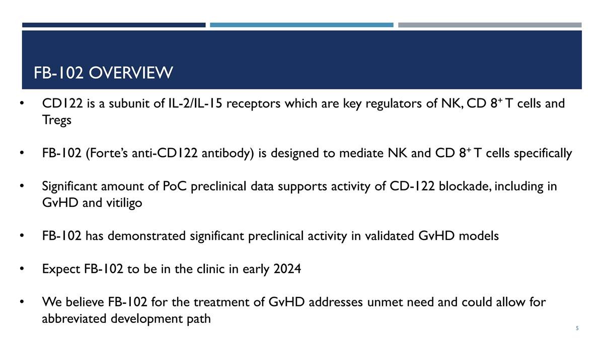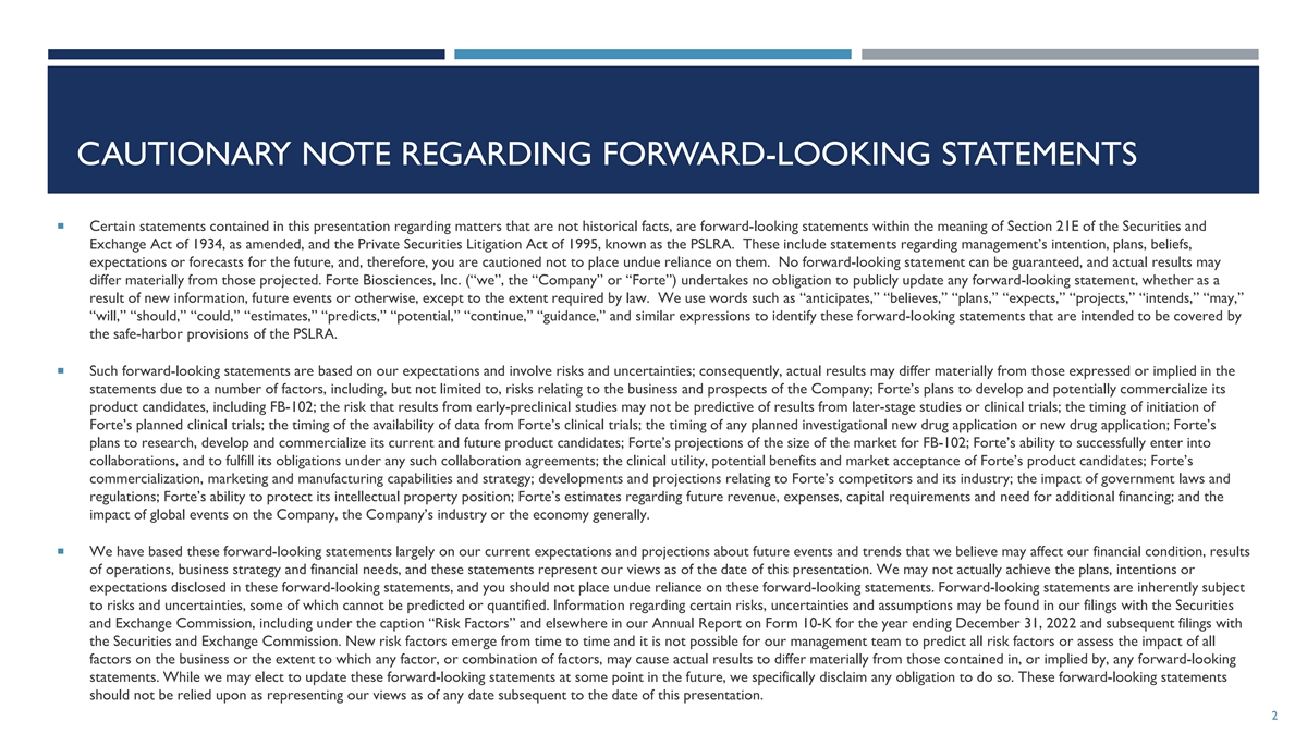 CAUTIONARY NOTE REGARDING FORWARD-LOOKING STATEMENTS ¡ Certain statements contained in this presentation regarding matters that are not historical facts, are forward-looking statements within the meaning of Section 21E of the Securities and Exchange Act of 1934, as amended, and the Private Securities Litigation Act of 1995, known as the PSLRA. These include statements regarding management’s intention, plans, beliefs, expectations or forecasts for the future, and, therefore, you are cautioned not to place undue reliance on them. No forward-looking statement can be guaranteed, and actual results may differ materially from those projected. Forte Biosciences, Inc. (“we”, the “Company” or “Forte”) undertakes no obligation to publicly update any forward-looking statement, whether as a result of new information, future events or otherwise, except to the extent required by law. We use words such as “anticipates,” “believes,” “plans,” “expects,” “projects,” “intends,” “may,” “will,” “should,” “could,” “estimates,” “predicts,” “potential,” “continue,” “guidance,” and similar expressions to identify these forward-looking statements that are intended to be covered by the safe-harbor provisions of the PSLRA. ¡ Such forward-looking statements are based on our expectations and involve risks and uncertainties; consequently, actual results may differ materially from those expressed or implied in the statements due to a number of factors, including, but not limited to, risks relating to the business and prospects of the Company; Forte’s plans to develop and potentially commercialize its product candidates, including FB-102; the risk that results from early-preclinical studies may not be predictive of results from later-stage studies or clinical trials; the timing of initiation of Forte’s planned clinical trials; the timing of the availability of data from Forte’s clinical trials; the timing of any planned investigational new drug application or new drug application; Forte’s plans to research, develop and commercialize its current and future product candidates; Forte’s projections of the size of the market for FB-102; Forte’s ability to successfully enter into collaborations, and to fulfill its obligations under any such collaboration agreements; the clinical utility, potential benefits and market acceptance of Forte’s product candidates; Forte’s commercialization, marketing and manufacturing capabilities and strategy; developments and projections relating to Forte’s competitors and its industry; the impact of government laws and regulations; Forte’s ability to protect its intellectual property position; Forte’s estimates regarding future revenue, expenses, capital requirements and need for additional financing; and the impact of global events on the Company, the Company’s industry or the economy generally. ¡ We have based these forward-looking statements largely on our current expectations and projections about future events and trends that we believe may affect our financial condition, results of operations, business strategy and financial needs, and these statements represent our views as of the date of this presentation. We may not actually achieve the plans, intentions or expectations disclosed in these forward-looking statements, and you should not place undue reliance on these forward-looking statements. Forward-looking statements are inherently subject to risks and uncertainties, some of which cannot be predicted or quantified. Information regarding certain risks, uncertainties and assumptions may be found in our filings with the Securities and Exchange Commission, including under the caption “Risk Factors” and elsewhere in our Annual Report on Form 10-K for the year ending December 31, 2022 and subsequent filings with the Securities and Exchange Commission. New risk factors emerge from time to time and it is not possible for our management team to predict all risk factors or assess the impact of all factors on the business or the extent to which any factor, or combination of factors, may cause actual results to differ materially from those contained in, or implied by, any forward-looking statements. While we may elect to update these forward-looking statements at some point in the future, we specifically disclaim any obligation to do so. These forward-looking statements should not be relied upon as representing our views as of any date subsequent to the date of this presentation. 2