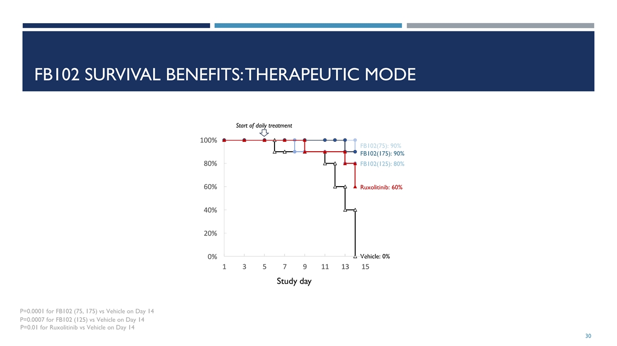 FB102 SURVIVAL BENEFITS: THERAPEUTIC MODE Start of daily treatment 1 1 1 1 10 0 0 0 00 0 0 0 0% % % % % FB102(75): 90% FB102(175): 90% 8 8 8 8 80 0 0 0 0% % % % % FB102(125): 80% 6 6 6 6 60 0 0 0 0% % % % % Ruxolitinib: 60% 4 4 4 4 40 0 0 0 0% % % % % 2 2 2 2 20 0 0 0 0% % % % % Vehicle: 0% 0 0 0 0 0% % % % % 1 1 1 1 1 3 3 3 3 3 5 5 5 5 5 7 7 7 7 7 9 9 9 9 9 1 1 1 1 11 1 1 1 1 1 1 1 1 13 3 3 3 3 1 1 1 1 15 5 5 5 5 Study day P=0.0001 for FB102 (75, 175) vs Vehicle on Day 14 P=0.0007 for FB102 (125) vs Vehicle on Day 14 P=0.01 for Ruxolitinib vs Vehicle on Day 14 30