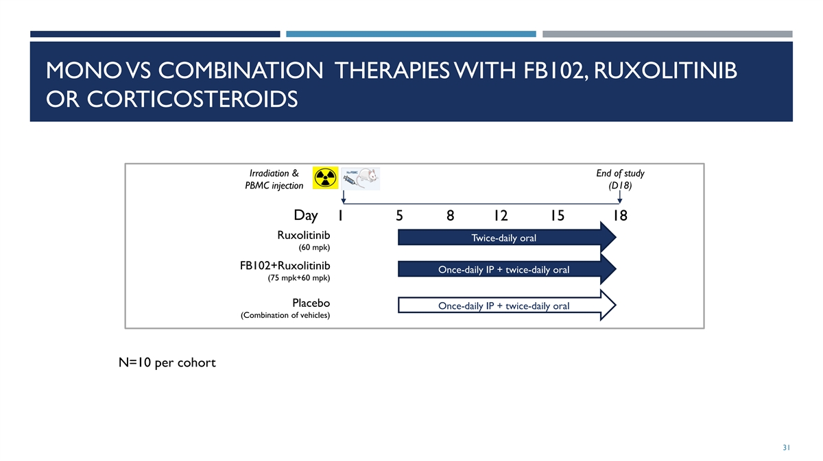MONO VS COMBINATION THERAPIES WITH FB102, RUXOLITINIB OR CORTICOSTEROIDS Irradiation & End of study PBMC injection (D18) Day 1 5 8 12 15 18 Ruxolitinib Twice-daily oral (60 mpk) FB102+Ruxolitinib Once-daily IP + twice-daily oral (75 mpk+60 mpk) Placebo Once-daily IP + twice-daily oral (Combination of vehicles) N=10 per cohort 31
