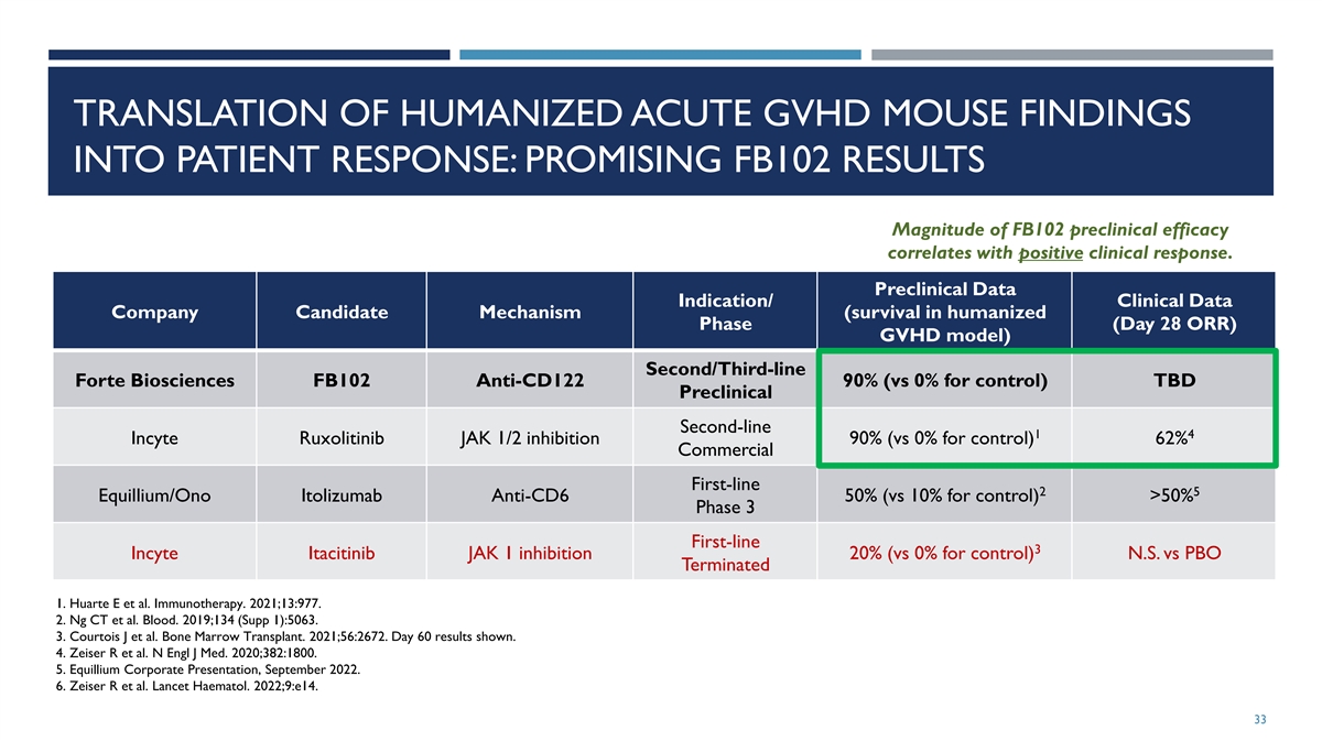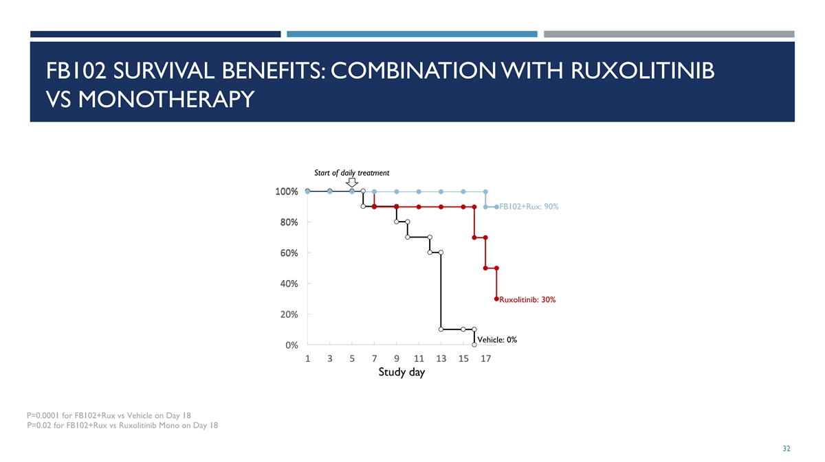 FB102 SURVIVAL BENEFITS: COMBINATION WITH RUXOLITINIB VS MONOTHERAPY Start of daily treatment 100% 1 10 00 0% % FB102+Rux: 90% 8 8 80 0 0% % % 6 6 60 0 0% % % 4 4 40 0 0% % % Ruxolitinib: 30% 2 2 20 0 0% % % Vehicle: 0% 0 0 0% % % 1 1 1 3 3 3 5 5 5 7 7 7 9 9 9 1 1 11 1 1 1 1 13 3 3 1 1 15 5 5 1 1 17 7 7 Study day P=0.0001 for FB102+Rux vs Vehicle on Day 18 P=0.02 for FB102+Rux vs Ruxolitinib Mono on Day 18 32