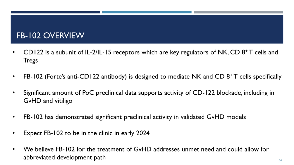 TRANSLATION OF HUMANIZED ACUTE GVHD MOUSE FINDINGS INTO PATIENT RESPONSE: PROMISING FB102 RESULTS Magnitude of FB102 preclinical efficacy correlates with positive clinical response. Preclinical Data Indication/ Clinical Data Company Candidate Mechanism (survival in humanized Phase (Day 28 ORR) GVHD model) Second/Third-line Forte Biosciences FB102 Anti-CD122 90% (vs 0% for control) TBD Preclinical Second-line 1 4 Incyte Ruxolitinib JAK 1/2 inhibition 90% (vs 0% for control) 62% Commercial First-line 2 5 Equillium/Ono Itolizumab Anti-CD6 50% (vs 10% for control) >50% Phase 3 First-line 3 Incyte Itacitinib JAK 1 inhibition 20% (vs 0% for control) N.S. vs PBO Terminated 1. Huarte E et al. Immunotherapy. 2021;13:977. 2. Ng CT et al. Blood. 2019;134 (Supp 1):5063. 3. Courtois J et al. Bone Marrow Transplant. 2021;56:2672. Day 60 results shown. 4. Zeiser R et al. N Engl J Med. 2020;382:1800. 5. Equillium Corporate Presentation, September 2022. 6. Zeiser R et al. Lancet Haematol. 2022;9:e14. 33