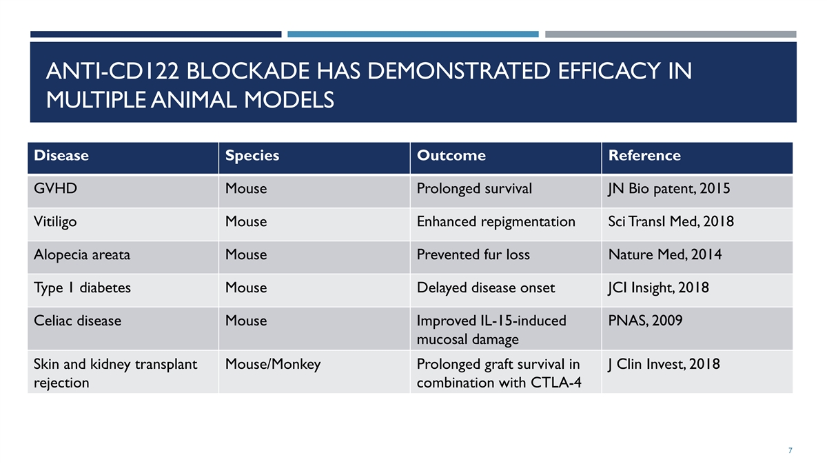 ANTI-CD122 BLOCKADE HAS DEMONSTRATED EFFICACY IN MULTIPLE ANIMAL MODELS Disease Species Outcome Reference GVHD Mouse Prolonged survival JN Bio patent, 2015 Vitiligo Mouse Enhanced repigmentation Sci Transl Med, 2018 Alopecia areata Mouse Prevented fur loss Nature Med, 2014 Type 1 diabetes Mouse Delayed disease onset JCI Insight, 2018 Celiac disease Mouse Improved IL-15-induced PNAS, 2009 mucosal damage Skin and kidney transplant Mouse/Monkey Prolonged graft survival in J Clin Invest, 2018 rejection combination with CTLA-4 7