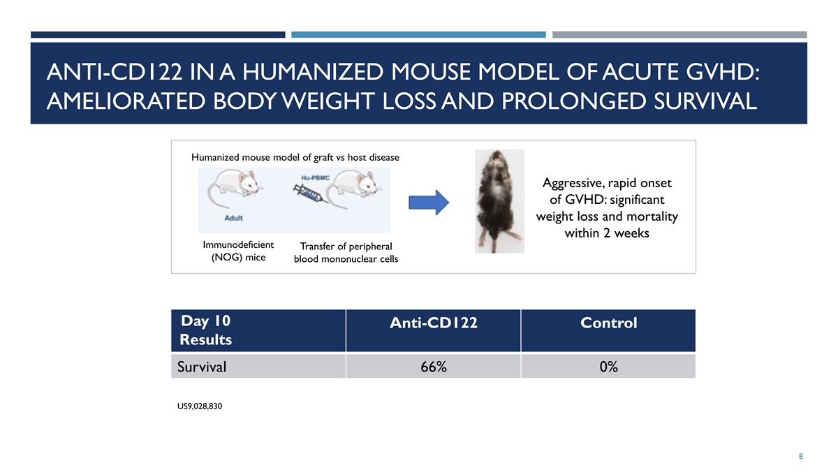 ANTI-CD122 IN A HUMANIZED MOUSE MODEL OF ACUTE GVHD: AMELIORATED BODY WEIGHT LOSS AND PROLONGED SURVIVAL Humanized mouse model of graft vs host disease Aggressive, rapid onset of GVHD: significant weight loss and mortality within 2 weeks Immunodeficient Transfer of peripheral (NOG) mice blood mononuclear cells Day 10 Anti-CD122 Control Results Survival 66% 0% US9,028,830 8