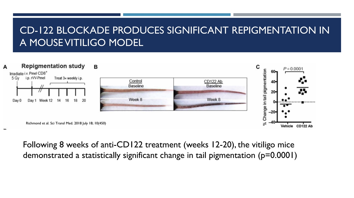 CD-122 BLOCKADE PRODUCES SIGNIFICANT REPIGMENTATION IN A MOUSE VITILIGO MODEL Richmond et al. Sci Transl Med. 2018 July 18; 10(450) Following 8 weeks of anti-CD122 treatment (weeks 12-20), the vitiligo mice demonstrated a statistically significant change in tail pigmentation (p=0.0001)