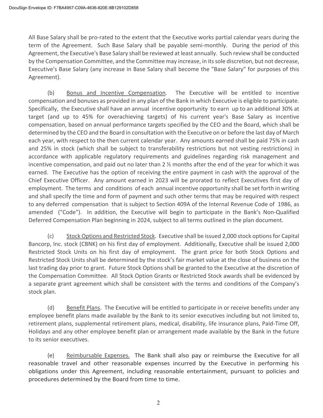 2 All Base Salary shall be pro‐rated to the extent that the Executive works partial calendar years during the  term  of  the  Agreement.    Such  Base  Salary  shall  be  payable  semi‐monthly.    During  the  period  of  this  Agreement, the Executive's Base Salary shall be reviewed at least annually.  Such review shall be conducted  by the Compensation Committee, and the Committee may increase, in its sole discretion, but not decrease,  Executive's Base Salary (any increase in Base Salary shall become the "Base Salary" for purposes of this  Agreement).    (b) Bonus  and  Incentive  Compensation.    The  Executive  will  be  entitled  to  incentive  compensation and bonuses as provided in any plan of the Bank in which Executive is eligible to participate.   Specifically,  the Executive shall have an annual  incentive opportunity  to earn  up to an additional 30% at  target  (and  up  to  45%  for  overachieving  targets)  of  his  current  year's  Base  Salary  as  incentive  compensation, based on annual performance targets specified by the CEO and the Board, which shall be  determined by the CEO and the Board in consultation with the Executive on or before the last day of March  each year, with respect to the then current calendar year.  Any amounts earned shall be paid 75% in cash  and  25%  in  stock  (which  shall  be  subject  to  transferability  restrictions  but  not  vesting  restrictions)  in  accordance  with  applicable  regulatory  requirements  and  guidelines  regarding  risk  management  and  incentive compensation, and paid out no later than 2 ½ months after the end of the year for which it was  earned.  The Executive has the option of receiving the entire payment in cash with the approval of the  Chief Executive Officer.   Any amount earned  in 2023 will be prorated  to  reflect Executives  first day of  employment.  The terms  and  conditions  of each  annual incentive opportunity shall be set forth in writing  and shall specify the time and form of payment and such other terms that may be required with respect  to any deferred  compensation  that is subject to Section 409A of the Internal Revenue Code of  1986, as  amended    ("Code").    In  addition,  the  Executive  will  begin  to  participate  in  the  Bank’s  Non‐Qualified  Deferred Compensation Plan beginning in 2024, subject to all terms outlined in the plan document.    (c) Stock Options and Restricted Stock.  Executive shall be issued 2,000 stock options for Capital  Bancorp, Inc. stock (CBNK) on his first day of employment.  Additionally, Executive shall be issued 2,000  Restricted  Stock  Units  on  his  first  day  of  employment.    The  grant  price  for  both  Stock  Options  and  Restricted Stock Units shall be determined by the stock’s fair market value at the close of business on the  last trading day prior to grant.  Future Stock Options shall be granted to the Executive at the discretion of  the Compensation Committee.  All Stock Option Grants or Restricted Stock awards shall be evidenced by  a separate grant agreement which shall be consistent with the terms and conditions of the Company’s  stock plan.    (d) Benefit Plans.  The Executive will be entitled to participate in or receive benefits under any  employee benefit plans made available by the Bank to its senior executives including but not limited to,  retirement plans, supplemental retirement plans, medical, disability, life insurance plans, Paid‐Time Off,  Holidays and any other employee benefit plan or arrangement made available by the Bank in the future  to its senior executives.        (e) Reimbursable  Expenses.    The  Bank  shall  also  pay  or  reimburse  the  Executive  for  all  reasonable  travel  and  other  reasonable  expenses  incurred  by  the  Executive  in  performing  his  obligations  under  this  Agreement,  including  reasonable  entertainment,  pursuant  to  policies  and  procedures determined by the Board from time to time.    DocuSign Envelope ID: F7BA4957-C09A-4636-820E-8B129102D858