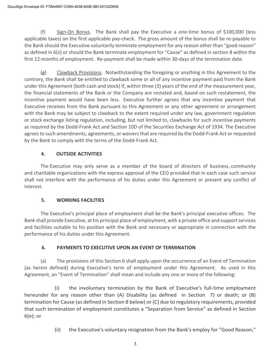 3 (f) Sign‐On  Bonus.    The  Bank  shall  pay  the  Executive  a  one‐time  bonus  of  $100,000  (less  applicable taxes) on the first applicable pay‐check.  The gross amount of the bonus shall be re‐payable to  the Bank should the Executive voluntarily terminate employment for any reason other than “good reason”  as defined in 6(ii) or should the Bank terminate employment for “Cause” as defined in section 8 within the  first 12‐months of employment.  Re‐payment shall be made within 30‐days of the termination date.     (g)  Clawback Provisions.  Notwithstanding the foregoing or anything in this Agreement to the  contrary, the Bank shall be entitled to clawback some or all of any incentive payment paid from the Bank  under this Agreement (both cash and stock) if, within three (3) years of the end of the measurement year,  the financial statements of the Bank or the Company are restated and, based on such restatement, the  incentive  payment  would  have  been  less.   Executive  further  agrees  that  any  incentive  payment  that  Executive receives from the Bank pursuant to this Agreement or any other agreement or arrangement  with the Bank may be subject to clawback to the extent required under any law, government regulation  or stock exchange listing regulation, including, but not limited to, clawbacks for such incentive payments  as required by the Dodd‐Frank Act and Section 10D of the Securities Exchange Act of 1934. The Executive  agrees to such amendments, agreements, or waivers that are required by the Dodd‐Frank Act or requested  by the Bank to comply with the terms of the Dodd‐Frank Act.    4. OUTSIDE ACTIVITIES  .  .  The Executive  may  only  serve  as  a  member  of  the  board  of  directors  of  business, community  and charitable organizations with the express approval of the CEO provided that in each case such service  shall  not  interfere with  the  performance of  his  duties  under  this  Agreement  or  present  any  conflict  of  interest.    5. WORKING FACILITIES    The Executive's principal place of employment shall be the Bank's principal executive offices.  The  Bank shall provide Executive, at his principal place of employment, with a private office and support services  and facilities suitable to his position with the Bank and necessary or appropriate  in connection with the  performance of his duties under this Agreement.    6. PAYMENTS TO EXECUTIVE UPON AN EVENT OF TERMINATION    (a) The provisions of this Section 6 shall apply upon the occurrence of an Event of Termination  (as  herein  defined)  during  Executive's  term  of  employment  under  this  Agreement.    As  used  in  this  Agreement, an "Event of Termination" shall mean and include any one or more of the following:    (i) the  involuntary  termination  by  the  Bank  of  Executive's  full‐time  employment  hereunder  for  any  reason  other  than  (A)  Disability  (as  defined    in  Section    7)  or  death;  or  (B)  termination for Cause (as defined in Section 8 below) or (C) due to regulatory requirements, provided  that such termination of employment constitutes a "Separation from Service" as defined in Section  6(e); or    (ii) the Executive's voluntary resignation from the Bank's employ for "Good Reason,"  DocuSign Envelope ID: F7BA4957-C09A-4636-820E-8B129102D858