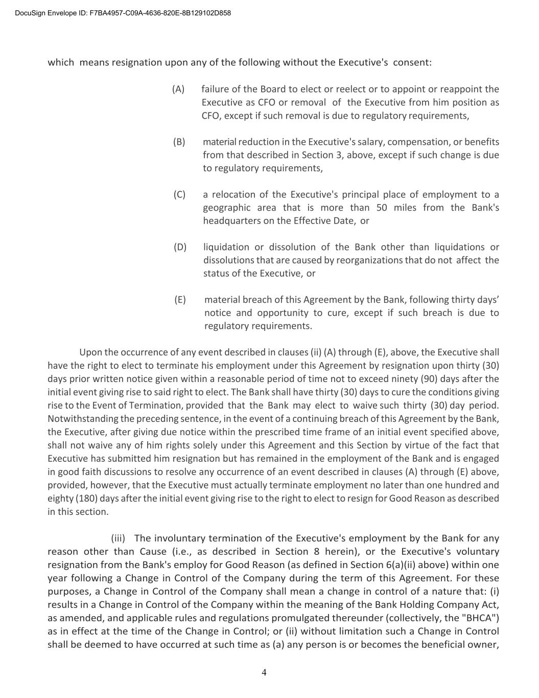 4 which  means resignation upon any of the following without the Executive's  consent:    (A) failure of the Board to elect or reelect or to appoint or reappoint the  Executive as CFO or removal  of  the Executive from him position as  CFO, except if such removal is due to regulatory requirements,    (B) material reduction in the Executive's salary, compensation, or benefits  from that described in Section 3, above, except if such change is due  to regulatory requirements,    (C) a  relocation  of  the  Executive's  principal  place  of  employment  to  a  geographic  area  that  is  more  than  50  miles  from  the  Bank's  headquarters on the Effective Date,  or    (D) liquidation  or  dissolution  of  the  Bank  other  than  liquidations  or  dissolutions that are caused by reorganizations that do not  affect  the  status of the Executive, or    (E) material breach of this Agreement by the Bank, following thirty days’  notice  and  opportunity  to  cure,  except  if  such  breach  is  due  to  regulatory requirements.    Upon the occurrence of any event described in clauses (ii) (A) through (E), above, the Executive shall  have the right to elect to terminate his employment under this Agreement by resignation upon thirty (30)  days prior written notice given within a reasonable period of time not to exceed ninety (90) days after the  initial event giving rise to said right to elect. The Bank shall have thirty (30) days to cure the conditions giving  rise to the Event of Termination, provided  that  the  Bank  may  elect  to  waive such  thirty  (30) day  period.    Notwithstanding the preceding sentence, in the event of a continuing breach of this Agreement by the Bank,  the Executive, after giving due notice within the prescribed time frame of an initial event specified above,  shall not waive any of him rights solely under this Agreement and this Section by virtue of the fact that  Executive has submitted him resignation but has remained in the employment of the Bank and is engaged  in good faith discussions to resolve any occurrence of an event described in clauses (A) through (E) above,  provided, however, that the Executive must actually terminate employment no later than one hundred and  eighty (180) days after the initial event giving rise to the right to elect to resign for Good Reason as described  in this section.    (iii)    The involuntary termination of the Executive's employment by the Bank for any  reason  other  than  Cause  (i.e.,  as  described  in  Section  8  herein),  or  the  Executive's  voluntary  resignation from the Bank's employ for Good Reason (as defined in Section 6(a)(ii) above) within one  year  following a Change  in Control of  the Company during the term of  this Agreement. For  these  purposes, a Change in Control of the Company shall mean a change in control of a nature that: (i)  results in a Change in Control of the Company within the meaning of the Bank Holding Company Act,  as amended, and applicable rules and regulations promulgated thereunder (collectively, the "BHCA")  as in effect at the time of the Change in Control; or (ii) without limitation such a Change in Control  shall be deemed to have occurred at such time as (a) any person is or becomes the beneficial owner,  DocuSign Envelope ID: F7BA4957-C09A-4636-820E-8B129102D858
