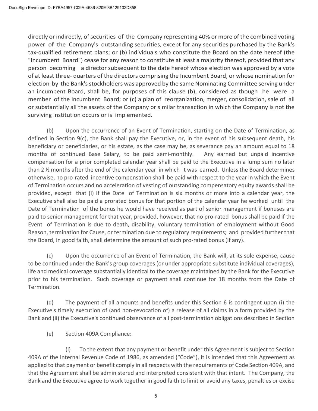 5 directly or indirectly, of securities  of  the  Company representing 40% or more of the combined voting  power  of  the  Company's  outstanding securities, except for any securities purchased by the Bank's  tax‐qualified retirement plans; or (b) individuals who constitute the Board on the date hereof (the  "Incumbent  Board") cease for any reason to constitute at least a majority thereof, provided that any  person  becoming    a director subsequent to the date hereof whose election was approved by a vote  of at least three‐ quarters of the directors comprising the Incumbent Board, or whose nomination for  election  by  the Bank's stockholders was approved by the same Nominating Committee serving under  an  incumbent Board,  shall  be,  for purposes of  this  clause  (b),  considered as  though   he   were    a  member  of the Incumbent  Board; or (c) a plan of  reorganization, merger, consolidation, sale of  all  or substantially all the assets of the Company or similar transaction in which the Company is not the  surviving institution occurs or is  implemented.    (b) Upon the occurrence of an Event of Termination, starting on the Date of Termination, as  defined  in Section 9(c),  the Bank shall pay  the Executive, or,  in  the event of his  subsequent death, his  beneficiary or beneficiaries, or his estate, as the case may be, as severance pay an amount equal to 18  months  of  continued  Base  Salary,  to  be  paid  semi‐monthly.      Any  earned  but  unpaid  incentive  compensation for a prior completed calendar year shall be paid to the Executive in a lump sum no later  than 2 ½ months after the end of the calendar year  in which  it was  earned.  Unless the Board determines  otherwise, no pro‐rated  incentive compensation shall  be paid with respect to the year in which the Event  of Termination occurs and no acceleration of vesting of outstanding compensatory equity awards shall be  provided,  except    that  (i)  if  the Date    of  Termination  is  six months  or more  into  a  calendar  year,  the  Executive shall also be paid a prorated bonus for that portion of the calendar year he worked  until  the  Date of Termination  of the bonus he would have received as part of senior management if bonuses are  paid to senior management for that year, provided, however, that no pro‐rated  bonus shall be paid if the  Event    of  Termination  is  due  to  death,  disability,  voluntary  termination of  employment without Good  Reason, termination for Cause, or termination due to regulatory requirements;  and  provided further that  the Board, in good faith, shall determine the amount of such pro‐rated bonus (if any).    (c) Upon the occurrence of an Event of Termination, the Bank will, at its sole expense, cause  to be continued under the Bank's group coverages (or under appropriate substitute individual coverages),  life and medical coverage substantially identical to the coverage maintained by the Bank for the Executive  prior  to  his  termination.    Such  coverage  or  payment  shall  continue  for  18 months  from  the  Date  of  Termination.    (d) The payment of all amounts and benefits under this Section 6  is contingent upon (i) the  Executive's timely execution of (and non‐revocation of) a release of all claims in a form provided by the  Bank and (ii) the Executive's continued observance of all post‐termination obligations described in Section     (e) Section 409A Compliance:      (i)  To the extent that any payment or benefit under this Agreement is subject to Section  409A of the Internal Revenue Code of 1986, as amended (“Code”), it is intended that this Agreement as  applied to that payment or benefit comply in all respects with the requirements of Code Section 409A, and  that the Agreement shall be administered and interpreted consistent with that intent.  The Company, the  Bank and the Executive agree to work together in good faith to limit or avoid any taxes, penalties or excise  DocuSign Envelope ID: F7BA4957-C09A-4636-820E-8B129102D858