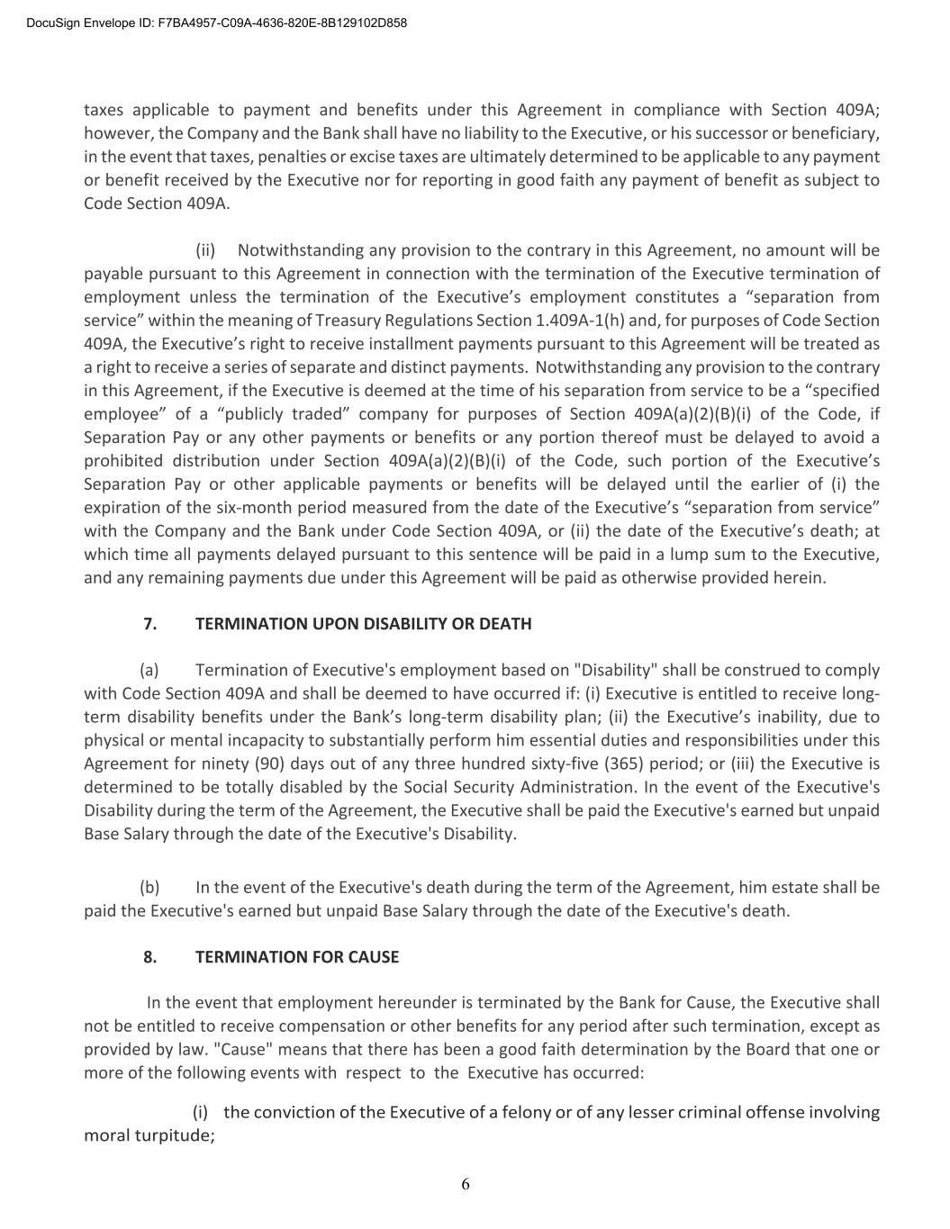 6 taxes  applicable  to  payment  and  benefits  under  this  Agreement  in  compliance  with  Section  409A;  however, the Company and the Bank shall have no liability to the Executive, or his successor or beneficiary,  in the event that taxes, penalties or excise taxes are ultimately determined to be applicable to any payment  or benefit received by the Executive nor for reporting in good faith any payment of benefit as subject to  Code Section 409A.            (ii)  Notwithstanding any provision to the contrary in this Agreement, no amount will be  payable pursuant to this Agreement in connection with the termination of the Executive termination of  employment  unless  the  termination  of  the  Executive’s  employment  constitutes  a  “separation  from  service” within the meaning of Treasury Regulations Section 1.409A‐1(h) and, for purposes of Code Section  409A, the Executive’s right to receive installment payments pursuant to this Agreement will be treated as  a right to receive a series of separate and distinct payments.  Notwithstanding any provision to the contrary  in this Agreement, if the Executive is deemed at the time of his separation from service to be a “specified  employee”  of  a  “publicly  traded”  company  for  purposes  of  Section  409A(a)(2)(B)(i)  of  the  Code,  if  Separation Pay or  any other payments or benefits or  any portion  thereof must be delayed  to avoid a  prohibited  distribution  under  Section  409A(a)(2)(B)(i)  of  the  Code,  such  portion  of  the  Executive’s  Separation  Pay  or  other  applicable  payments  or  benefits  will  be  delayed  until  the  earlier  of  (i)  the  expiration of the six‐month period measured from the date of the Executive’s “separation from service”  with the Company and the Bank under Code Section 409A, or (ii)  the date of the Executive’s death; at  which time all payments delayed pursuant to this sentence will be paid in a lump sum to the Executive,  and any remaining payments due under this Agreement will be paid as otherwise provided herein.    7. TERMINATION UPON DISABILITY OR DEATH    (a) Termination of Executive's employment based on "Disability" shall be construed to comply  with Code Section 409A and shall be deemed to have occurred if: (i) Executive is entitled to receive long‐ term disability  benefits under  the Bank’s  long‐term disability  plan;  (ii)  the Executive’s  inability,  due  to  physical or mental incapacity to substantially perform him essential duties and responsibilities under this  Agreement for ninety (90) days out of any three hundred sixty‐five (365) period; or (iii) the Executive is  determined to be totally disabled by the Social Security Administration.  In the event of the Executive's  Disability during the term of the Agreement, the Executive shall be paid the Executive's earned but unpaid  Base Salary through the date of the Executive's Disability.    (b) In the event of the Executive's death during the term of the Agreement, him estate shall be  paid the Executive's earned but unpaid Base Salary through the date of the Executive's death.    8. TERMINATION FOR CAUSE    In the event that employment hereunder is terminated by the Bank for Cause, the Executive shall  not be entitled to receive compensation or other benefits for any period after such termination, except as  provided by law. "Cause" means that there has been a good faith determination by the Board that one or  more of the following events with  respect  to  the  Executive has occurred:   (i)   the conviction of the Executive of a felony or of any lesser criminal offense involving  moral turpitude;   DocuSign Envelope ID: F7BA4957-C09A-4636-820E-8B129102D858