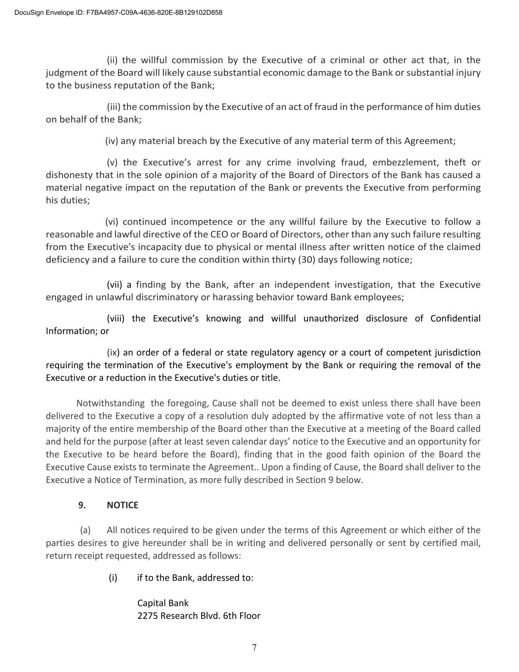 7 (ii)  the  willful  commission  by  the  Executive  of  a  criminal  or  other  act  that,  in  the  judgment of the Board will likely cause substantial economic damage to the Bank or substantial injury  to the business reputation of the Bank;  (iii) the commission by the Executive of an act of fraud in the performance of him duties  on behalf of the Bank;   (iv) any material breach by the Executive of any material term of this Agreement;   (v)  the  Executive’s  arrest  for  any  crime  involving  fraud,  embezzlement,  theft  or  dishonesty that in the sole opinion of a majority of the Board of Directors of the Bank has caused a  material negative impact on the reputation of the Bank or prevents the Executive from performing  his duties;   (vi)  continued  incompetence  or  the  any  willful  failure  by  the  Executive  to  follow  a  reasonable and lawful directive of the CEO or Board of Directors, other than any such failure resulting  from the Executive's incapacity due to physical or mental illness after written notice of the claimed  deficiency and a failure to cure the condition within thirty (30) days following notice;        (vii)  a  finding  by  the  Bank,  after  an  independent  investigation,  that  the  Executive  engaged in unlawful discriminatory or harassing behavior toward Bank employees;  (viii)  the  Executive’s  knowing  and  willful  unauthorized  disclosure  of  Confidential  Information; or   (ix) an order of a federal or state regulatory agency or a court of competent  jurisdiction  requiring  the  termination of  the Executive's  employment by  the Bank or  requiring  the  removal of  the  Executive or a reduction in the Executive's duties or title.      Notwithstanding  the foregoing, Cause shall not be deemed to exist unless there shall have been  delivered to the Executive a copy of a resolution duly adopted by the affirmative vote of not less than a  majority of the entire membership of the Board other than the Executive at a meeting of the Board called  and held for the purpose (after at least seven calendar days’ notice to the Executive and an opportunity for  the  Executive  to  be  heard  before  the  Board),  finding  that  in  the  good  faith  opinion  of  the  Board  the  Executive Cause exists to terminate the Agreement.. Upon a finding of Cause, the Board shall deliver to the  Executive a Notice of Termination, as more fully described in Section 9 below.    9. NOTICE    (a) All notices required to be given under the terms of this Agreement or which either of the  parties desires  to give hereunder shall be  in writing and delivered personally or sent by certified mail,  return receipt requested, addressed as follows:  (i) if to the Bank, addressed to:     Capital Bank  2275 Research Blvd. 6th Floor  DocuSign Envelope ID: F7BA4957-C09A-4636-820E-8B129102D858