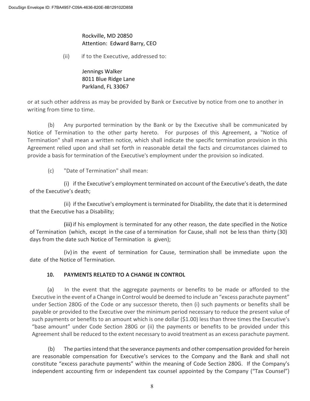 8 Rockville, MD 20850  Attention:  Edward Barry, CEO  (ii)  if to the Executive, addressed to:    Jennings Walker  8011 Blue Ridge Lane  Parkland, FL 33067    or at such other address as may be provided by Bank or Executive by notice from one to another in  writing from time to time.    (b) Any  purported  termination  by  the  Bank  or  by  the  Executive  shall  be  communicated  by  Notice  of  Termination  to  the  other  party  hereto.    For  purposes  of  this  Agreement,  a  "Notice  of  Termination" shall mean a written notice, which shall  indicate the specific termination provision in this  Agreement relied upon and shall  set  forth  in reasonable detail  the  facts and circumstances claimed to  provide a basis for termination of the Executive's employment under the provision so indicated.    (c) "Date of Termination" shall mean:  (i) if the Executive’s employment terminated on account of the Executive’s death, the date  of the Executive’s death;  (ii) if the Executive's employment is terminated for Disability, the date that it is determined  that the Executive has a Disability;  (iii) if his employment is terminated for any other reason, the date specified in the Notice  of Termination  (which,  except  in the case of a termination  for Cause, shall  not  be less than  thirty (30)  days from the date such Notice of Termination  is  given);   (iv) in  the  event  of  termination  for Cause,  termination shall  be immediate  upon  the   date  of the Notice of Termination.    10. PAYMENTS RELATED TO A CHANGE IN CONTROL    (a)   In  the  event  that  the  aggregate  payments  or  benefits  to  be  made  or  afforded  to  the  Executive in the event of a Change in Control would be deemed to include an “excess parachute payment”  under Section 280G of the Code or any successor thereto, then (i) such payments or benefits shall be  payable or provided to the Executive over the minimum period necessary to reduce the present value of  such payments or benefits to an amount which is one dollar ($1.00) less than three times the Executive’s  “base  amount”  under  Code  Section  280G  or  (ii)  the  payments  or  benefits  to  be  provided  under  this  Agreement shall be reduced to the extent necessary to avoid treatment as an excess parachute payment.      (b)  The parties intend that the severance payments and other compensation provided for herein  are  reasonable  compensation  for  Executive’s  services  to  the  Company  and  the  Bank  and  shall  not  constitute “excess parachute payments” within the meaning of Code Section 280G.    If  the Company’s  independent accounting  firm or  independent  tax  counsel appointed by  the Company  (“Tax Counsel”)  DocuSign Envelope ID: F7BA4957-C09A-4636-820E-8B129102D858