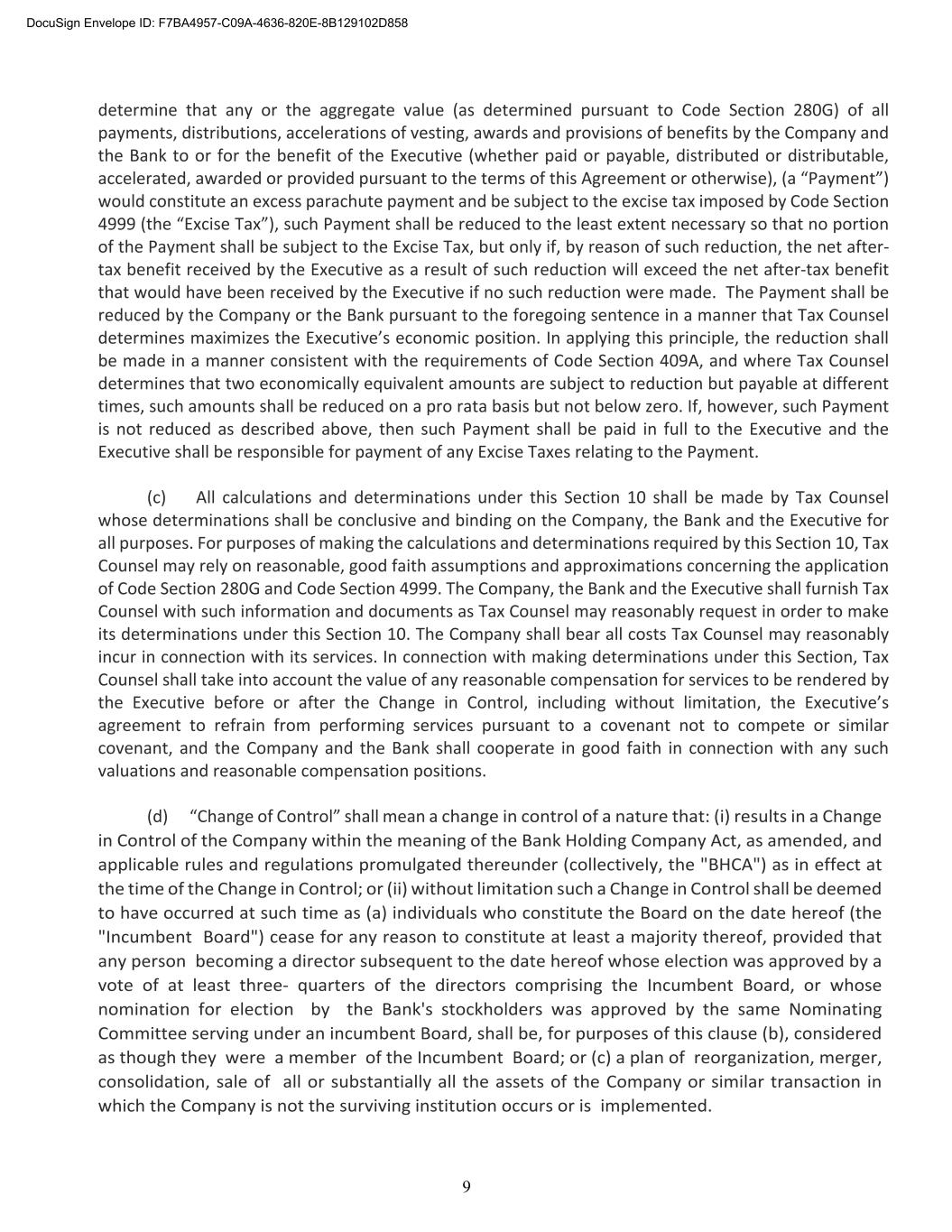9 determine  that  any  or  the  aggregate  value  (as  determined  pursuant  to  Code  Section  280G)  of  all  payments, distributions, accelerations of vesting, awards and provisions of benefits by the Company and  the Bank to or  for the benefit of  the Executive (whether paid or payable, distributed or distributable,  accelerated, awarded or provided pursuant to the terms of this Agreement or otherwise), (a “Payment”)  would constitute an excess parachute payment and be subject to the excise tax imposed by Code Section  4999 (the “Excise Tax”), such Payment shall be reduced to the least extent necessary so that no portion  of the Payment shall be subject to the Excise Tax, but only if, by reason of such reduction, the net after‐ tax benefit received by the Executive as a result of such reduction will exceed the net after‐tax benefit  that would have been received by the Executive if no such reduction were made.  The Payment shall be  reduced by the Company or the Bank pursuant to the foregoing sentence in a manner that Tax Counsel  determines maximizes the Executive’s economic position. In applying this principle, the reduction shall  be made in a manner consistent with the requirements of Code Section 409A, and where Tax Counsel  determines that two economically equivalent amounts are subject to reduction but payable at different  times, such amounts shall be reduced on a pro rata basis but not below zero. If, however, such Payment  is  not  reduced  as  described  above,  then  such Payment  shall  be paid  in  full  to  the  Executive  and  the  Executive shall be responsible for payment of any Excise Taxes relating to the Payment.    (c)  All  calculations  and  determinations  under  this  Section  10  shall  be made  by  Tax  Counsel  whose determinations shall be conclusive and binding on the Company, the Bank and the Executive for  all purposes. For purposes of making the calculations and determinations required by this Section 10, Tax  Counsel may rely on reasonable, good faith assumptions and approximations concerning the application  of Code Section 280G and Code Section 4999. The Company, the Bank and the Executive shall furnish Tax  Counsel with such information and documents as Tax Counsel may reasonably request in order to make  its determinations under this Section 10. The Company shall bear all costs Tax Counsel may reasonably  incur in connection with its services. In connection with making determinations under this Section, Tax  Counsel shall take into account the value of any reasonable compensation for services to be rendered by  the  Executive  before  or  after  the  Change  in  Control,  including  without  limitation,  the  Executive’s  agreement  to  refrain  from  performing  services  pursuant  to  a  covenant  not  to  compete  or  similar  covenant,  and  the Company and  the Bank  shall  cooperate  in  good  faith  in  connection with  any  such  valuations and reasonable compensation positions.    (d)      “Change of Control” shall mean a change in control of a nature that: (i) results in a Change  in Control of the Company within the meaning of the Bank Holding Company Act, as amended, and  applicable rules and regulations promulgated thereunder (collectively, the "BHCA") as in effect at  the time of the Change in Control; or (ii) without limitation such a Change in Control shall be deemed  to have occurred at such time as (a) individuals who constitute the Board on the date hereof (the  "Incumbent  Board") cease for any reason to constitute at least a majority thereof, provided that  any person  becoming a director subsequent to the date hereof whose election was approved by a  vote  of  at  least  three‐  quarters  of  the  directors  comprising  the  Incumbent  Board,  or  whose  nomination  for  election    by    the  Bank's  stockholders  was  approved  by  the  same  Nominating  Committee serving under an incumbent Board, shall be, for purposes of this clause (b), considered  as though they  were  a member  of the Incumbent  Board; or (c) a plan of  reorganization, merger,  consolidation, sale of   all or substantially all  the assets of  the Company or similar transaction  in  which the Company is not the surviving institution occurs or is  implemented.     DocuSign Envelope ID: F7BA4957-C09A-4636-820E-8B129102D858