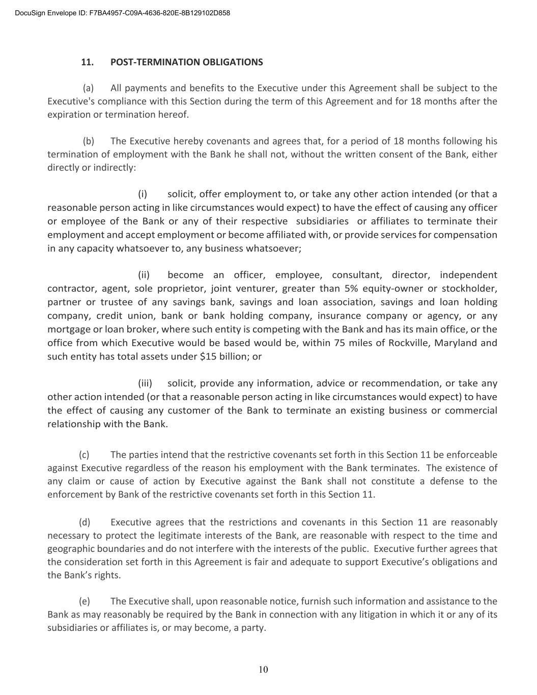 10 11. POST‐TERMINATION OBLIGATIONS    (a) All payments and benefits to the Executive under this Agreement shall be subject to the  Executive's compliance with this Section during the term of this Agreement and for 18 months after the  expiration or termination hereof.    (b) The Executive hereby covenants and agrees that, for a period of 18 months following his  termination of employment with the Bank he shall not, without the written consent of the Bank, either  directly or indirectly:    (i) solicit, offer employment to, or take any other action intended (or that a  reasonable person acting in like circumstances would expect) to have the effect of causing any officer  or  employee  of  the  Bank  or  any  of  their  respective    subsidiaries    or  affiliates  to  terminate  their  employment and accept employment or become affiliated with, or provide services for compensation  in any capacity whatsoever to, any business whatsoever;    (ii) become  an  officer,  employee,  consultant,  director,  independent  contractor,  agent,  sole  proprietor,  joint  venturer,  greater  than  5%  equity‐owner  or  stockholder,  partner  or  trustee  of  any  savings  bank,  savings  and  loan  association,  savings  and  loan  holding  company,  credit  union,  bank  or  bank  holding  company,  insurance  company  or  agency,  or  any  mortgage or loan broker, where such entity is competing with the Bank and has its main office, or the  office from which Executive would be based would be, within 75 miles of Rockville, Maryland and  such entity has total assets under $15 billion; or    (iii) solicit, provide any information, advice or recommendation, or take any  other action intended (or that a reasonable person acting in like circumstances would expect) to have  the  effect  of  causing  any  customer  of  the  Bank  to  terminate  an  existing  business  or  commercial  relationship with the Bank.    (c) The parties intend that the restrictive covenants set forth in this Section 11 be enforceable  against Executive regardless of the reason his employment with the Bank terminates.  The existence of  any  claim  or  cause  of  action  by  Executive  against  the  Bank  shall  not  constitute  a  defense  to  the  enforcement by Bank of the restrictive covenants set forth in this Section 11.    (d) Executive  agrees  that  the  restrictions  and  covenants  in  this  Section  11  are  reasonably  necessary to protect the  legitimate  interests of the Bank, are reasonable with respect to the time and  geographic boundaries and do not interfere with the interests of the public.  Executive further agrees that  the consideration set forth in this Agreement is fair and adequate to support Executive’s obligations and  the Bank’s rights.      (e) The Executive shall, upon reasonable notice, furnish such information and assistance to the  Bank as may reasonably be required by the Bank in connection with any litigation in which it or any of its  subsidiaries or affiliates is, or may become, a party.    DocuSign Envelope ID: F7BA4957-C09A-4636-820E-8B129102D858