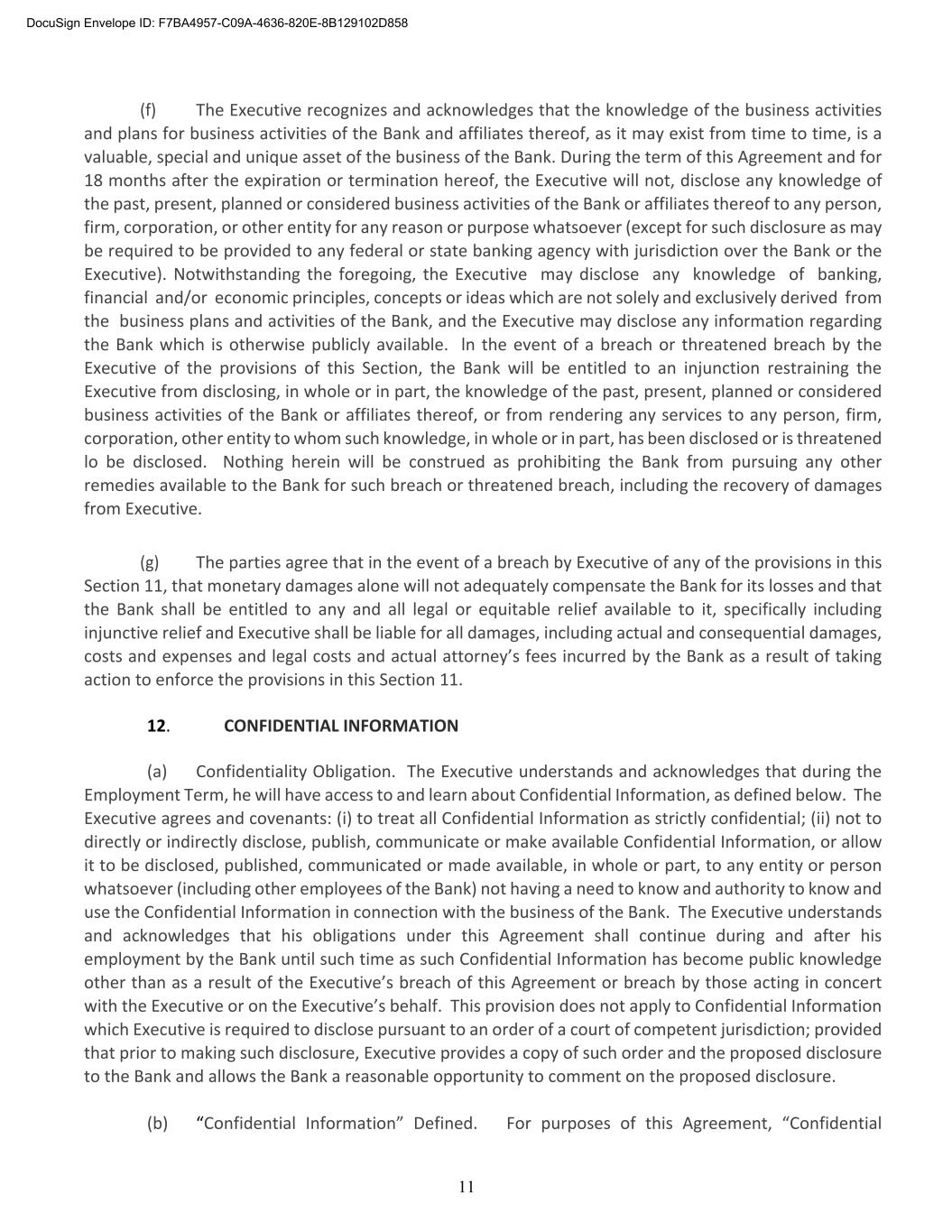 11 (f) The Executive recognizes and acknowledges that the knowledge of the business activities  and plans for business activities of the Bank and affiliates thereof, as it may exist from time to time, is a  valuable, special and unique asset of the business of the Bank. During the term of this Agreement and for  18 months after the expiration or termination hereof, the Executive will not, disclose any knowledge of  the past, present, planned or considered business activities of the Bank or affiliates thereof to any person,  firm, corporation, or other entity for any reason or purpose whatsoever (except for such disclosure as may  be required to be provided to any federal or state banking agency with jurisdiction over the Bank or the  Executive). Notwithstanding  the  foregoing,  the Executive   may disclose    any    knowledge    of    banking,   financial  and/or  economic principles, concepts or ideas which are not solely and exclusively derived  from  the  business plans and activities of the Bank, and the Executive may disclose any information regarding  the Bank which  is otherwise publicly available.    ln  the event of a breach or  threatened breach by  the  Executive  of  the  provisions  of  this  Section,  the  Bank  will  be  entitled  to  an  injunction  restraining  the  Executive from disclosing, in whole or in part, the knowledge of the past, present, planned or considered  business activities of the Bank or affiliates thereof, or from rendering any services to any person, firm,  corporation, other entity to whom such knowledge, in whole or in part, has been disclosed or is threatened  lo  be  disclosed.    Nothing  herein  will  be  construed  as  prohibiting  the  Bank  from  pursuing  any  other  remedies available to the Bank for such breach or threatened breach, including the recovery of damages  from Executive.    (g) The parties agree that in the event of a breach by Executive of any of the provisions in this  Section 11, that monetary damages alone will not adequately compensate the Bank for its losses and that  the  Bank  shall  be  entitled  to  any  and  all  legal  or  equitable  relief  available  to  it,  specifically  including  injunctive relief and Executive shall be liable for all damages, including actual and consequential damages,  costs and expenses and legal costs and actual attorney’s fees incurred by the Bank as a result of taking  action to enforce the provisions in this Section 11.    12.  CONFIDENTIAL INFORMATION       (a) Confidentiality Obligation.  The Executive understands and acknowledges that during the  Employment Term, he will have access to and learn about Confidential Information, as defined below.  The  Executive agrees and covenants: (i) to treat all Confidential Information as strictly confidential; (ii) not to  directly or indirectly disclose, publish, communicate or make available Confidential Information, or allow  it to be disclosed, published, communicated or made available, in whole or part, to any entity or person  whatsoever (including other employees of the Bank) not having a need to know and authority to know and  use the Confidential Information in connection with the business of the Bank.  The Executive understands  and  acknowledges  that  his  obligations  under  this  Agreement  shall  continue  during  and  after  his  employment by the Bank until such time as such Confidential Information has become public knowledge  other than as a result of the Executive’s breach of this Agreement or breach by those acting in concert  with the Executive or on the Executive’s behalf.  This provision does not apply to Confidential Information  which Executive is required to disclose pursuant to an order of a court of competent jurisdiction; provided  that prior to making such disclosure, Executive provides a copy of such order and the proposed disclosure  to the Bank and allows the Bank a reasonable opportunity to comment on the proposed disclosure.    (b) “Confidential  Information”  Defined.      For  purposes  of  this  Agreement,  “Confidential  DocuSign Envelope ID: F7BA4957-C09A-4636-820E-8B129102D858