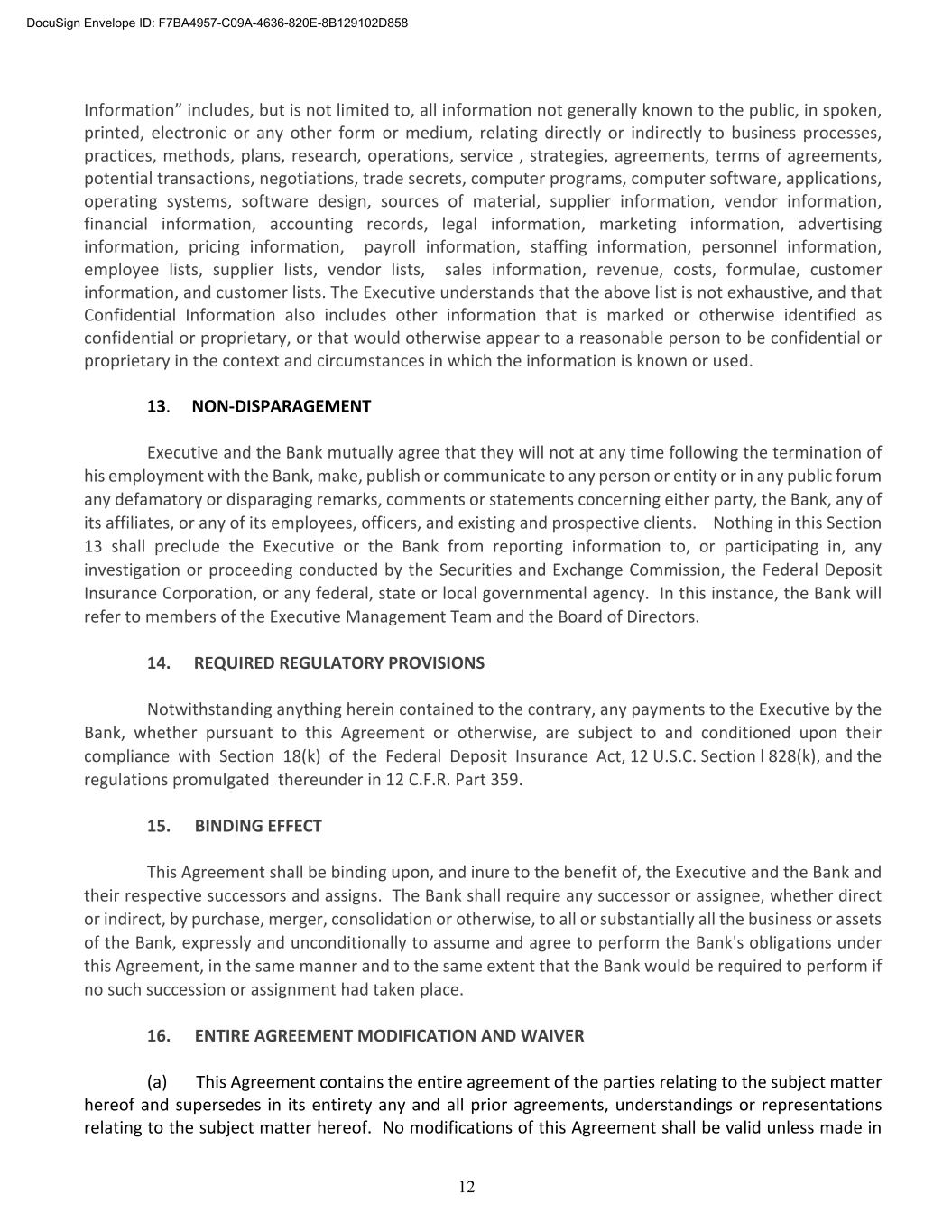 12 Information” includes, but is not limited to, all information not generally known to the public, in spoken,  printed,  electronic  or  any  other  form or medium,  relating  directly  or  indirectly  to  business  processes,  practices, methods, plans, research, operations, service  , strategies, agreements,  terms of agreements,  potential transactions, negotiations, trade secrets, computer programs, computer software, applications,  operating  systems,  software  design,  sources  of  material,  supplier  information,  vendor  information,  financial  information,  accounting  records,  legal  information,  marketing  information,  advertising  information,  pricing  information,    payroll  information,  staffing  information,  personnel  information,  employee  lists,  supplier  lists,  vendor  lists,    sales  information,  revenue,  costs,  formulae,  customer  information, and customer lists. The Executive understands that the above list is not exhaustive, and that  Confidential  Information  also  includes  other  information  that  is  marked  or  otherwise  identified  as  confidential or proprietary, or that would otherwise appear to a reasonable person to be confidential or  proprietary in the context and circumstances in which the information is known or used.     13.  NON‐DISPARAGEMENT    Executive and the Bank mutually agree that they will not at any time following the termination of  his employment with the Bank, make, publish or communicate to any person or entity or in any public forum  any defamatory or disparaging remarks, comments or statements concerning either party, the Bank, any of  its affiliates, or any of its employees, officers, and existing and prospective clients.    Nothing in this Section  13  shall  preclude  the  Executive  or  the  Bank  from  reporting  information  to,  or  participating  in,  any  investigation or proceeding conducted by  the Securities and Exchange Commission,  the Federal Deposit  Insurance Corporation, or any federal, state or local governmental agency.  In this instance, the Bank will  refer to members of the Executive Management Team and the Board of Directors.    14.  REQUIRED REGULATORY PROVISIONS    Notwithstanding anything herein contained to the contrary, any payments to the Executive by the  Bank,  whether  pursuant  to  this  Agreement  or  otherwise,  are  subject  to  and  conditioned  upon  their  compliance  with  Section  18(k)  of  the  Federal  Deposit  Insurance  Act, 12 U.S.C. Section l 828(k), and the  regulations promulgated  thereunder in 12 C.F.R. Part 359.    15.  BINDING EFFECT    This Agreement shall be binding upon, and inure to the benefit of, the Executive and the Bank and  their respective successors and assigns.  The Bank shall require any successor or assignee, whether direct  or indirect, by purchase, merger, consolidation or otherwise, to all or substantially all the business or assets  of the Bank, expressly and unconditionally to assume and agree to perform the Bank's obligations under  this Agreement, in the same manner and to the same extent that the Bank would be required to perform if  no such succession or assignment had taken place.    16.  ENTIRE AGREEMENT MODIFICATION AND WAIVER    (a) This Agreement contains the entire agreement of the parties relating to the subject matter  hereof and supersedes  in  its entirety any and all prior agreements, understandings or  representations  relating to the subject matter hereof.  No modifications of this Agreement shall be valid unless made in  DocuSign Envelope ID: F7BA4957-C09A-4636-820E-8B129102D858