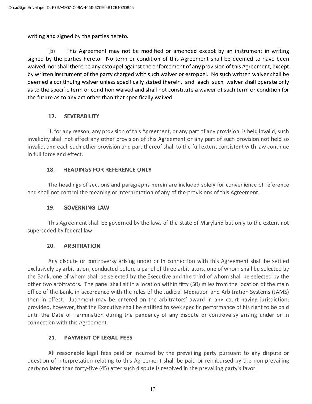 13 writing and signed by the parties hereto.    (b)   This  Agreement may  not  be modified  or  amended  except  by  an  instrument  in writing  signed by  the parties hereto.   No  term or  condition of  this Agreement  shall be deemed  to have been  waived, nor shall there be any estoppel against the enforcement of any provision of this Agreement, except  by written instrument of the party charged with such waiver or estoppel.  No such written waiver shall be  deemed a continuing waiver unless specifically stated therein,  and  each  such  waiver shall operate only  as to the specific term or condition waived and shall not constitute a waiver of such term or condition for  the future as to any act other than that specifically waived.    17.  SEVERABILITY    If, for any reason, any provision of this Agreement, or any part of any provision, is held invalid, such  invalidity shall not affect any other provision of this Agreement or any part of such provision not held so  invalid, and each such other provision and part thereof shall to the full extent consistent with law continue  in full force and effect.    18.  HEADINGS FOR REFERENCE ONLY    The headings of sections and paragraphs herein are included solely for convenience of reference  and shall not control the meaning or interpretation of any of the provisions of this Agreement.     19.  GOVERNING  LAW    This Agreement shall be governed by the laws of the State of Maryland but only to the extent not  superseded by federal law.    20.  ARBITRATION    Any dispute or  controversy arising under or  in  connection with  this Agreement  shall be  settled  exclusively by arbitration, conducted before a panel of three arbitrators, one of whom shall be selected by  the Bank, one of whom shall be selected by the Executive and the third of whom shall be selected by the  other two arbitrators.  The panel shall sit in a location within fifty (50) miles from the location of the main  office of the Bank, in accordance with the rules of the Judicial Mediation and Arbitration Systems (JAMS)  then  in  effect.    Judgment  may  be  entered  on  the  arbitrators’  award  in  any  court  having  jurisdiction;  provided, however, that the Executive shall be entitled to seek specific performance of his right to be paid  until  the  Date  of  Termination  during  the  pendency  of  any  dispute  or  controversy  arising  under  or  in  connection with this Agreement.    21. PAYMENT OF LEGAL  FEES    All  reasonable  legal  fees  paid  or  incurred  by  the  prevailing  party  pursuant  to  any  dispute  or  question of  interpretation  relating  to  this Agreement shall be paid or  reimbursed by  the non‐prevailing  party no later than forty‐five (45) after such dispute is resolved in the prevailing party's favor.  DocuSign Envelope ID: F7BA4957-C09A-4636-820E-8B129102D858