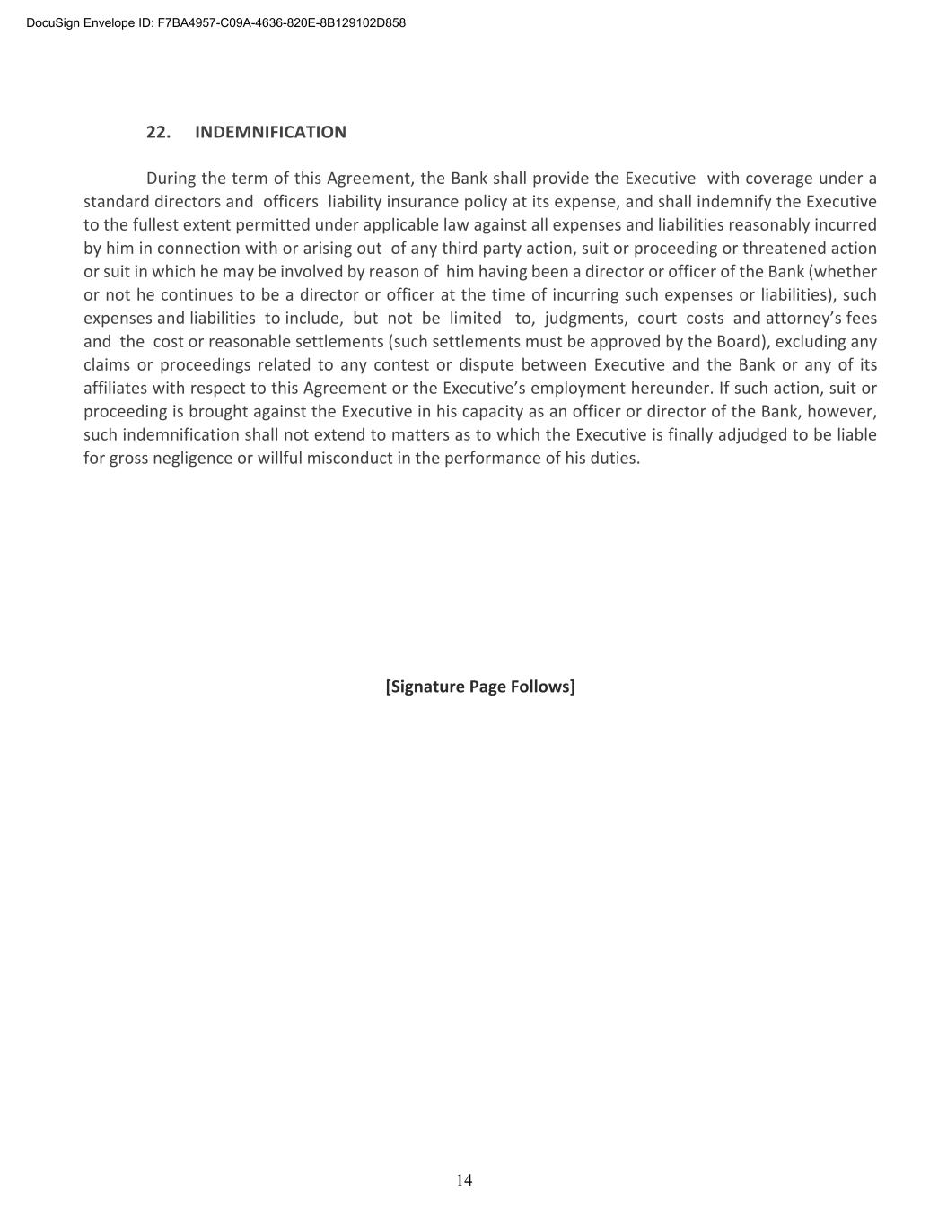 14   22. INDEMNIFICATION    During the term of this Agreement, the Bank shall provide the Executive  with coverage under a  standard directors and  officers  liability insurance policy at its expense, and shall indemnify the Executive   to the fullest extent permitted under applicable law against all expenses and liabilities reasonably incurred  by him in connection with or arising out  of any third party action, suit or proceeding or threatened action  or suit in which he may be involved by reason of  him having been a director or officer of the Bank (whether  or not he continues to be a director or officer at the time of  incurring such expenses or  liabilities), such  expenses and liabilities  to include,  but  not  be  limited   to,  judgments,  court  costs  and attorney’s fees   and  the  cost or reasonable settlements (such settlements must be approved by the Board), excluding any  claims  or  proceedings  related  to  any  contest  or  dispute  between  Executive  and  the  Bank  or  any  of  its  affiliates with respect to this Agreement or the Executive’s employment hereunder. If such action, suit or  proceeding is brought against the Executive in his capacity as an officer or director of the Bank, however,  such indemnification shall not extend to matters as to which the Executive is finally adjudged to be liable  for gross negligence or willful misconduct in the performance of his duties.                    [Signature Page Follows]  DocuSign Envelope ID: F7BA4957-C09A-4636-820E-8B129102D858