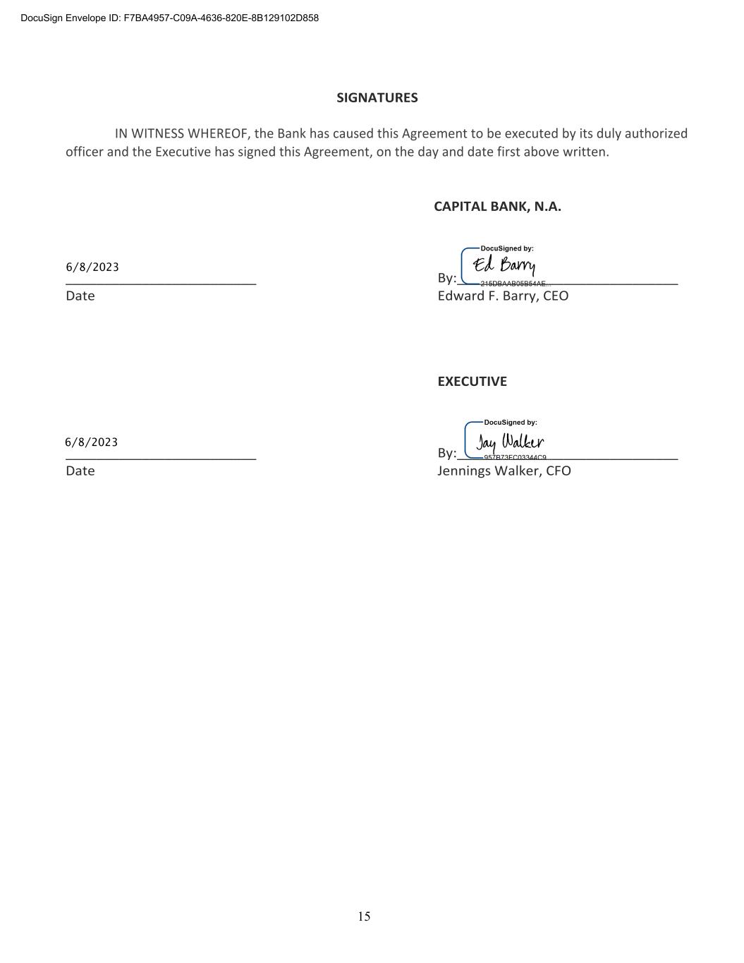 15 SIGNATURES    IN WITNESS WHEREOF, the Bank has caused this Agreement to be executed by its duly authorized  officer and the Executive has signed this Agreement, on the day and date first above written.      CAPITAL BANK, N.A.        _________________________          By:_____________________________  Date                Edward F. Barry, CEO      EXECUTIVE        _________________________          By:_____________________________  Date                Jennings Walker, CFO        DocuSign Envelope ID: F7BA4957-C09A-4636-820E-8B129102D858 6/8/2023 6/8/2023