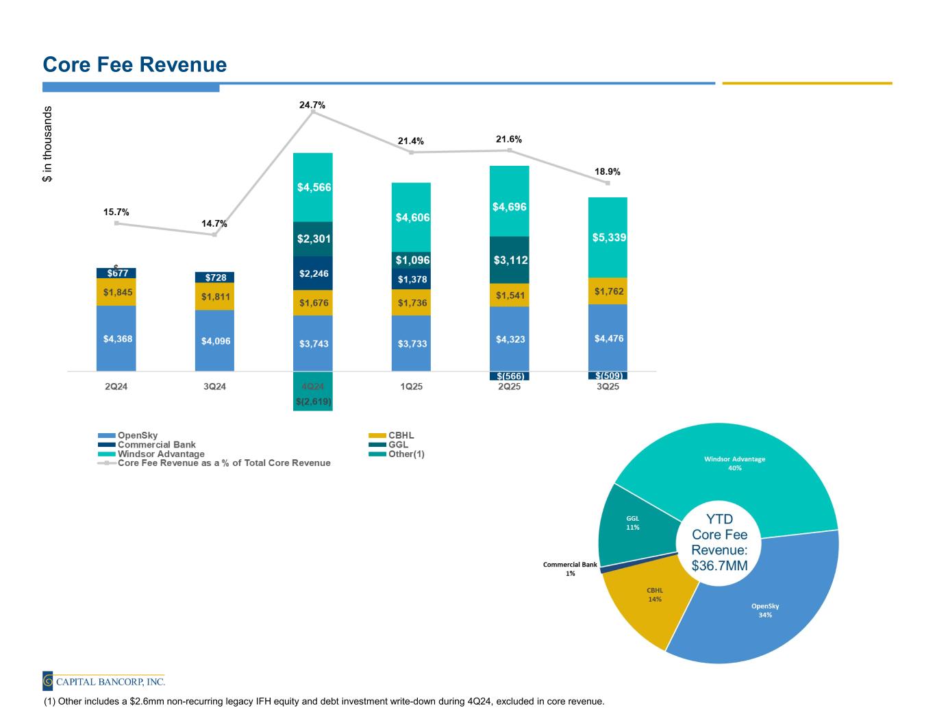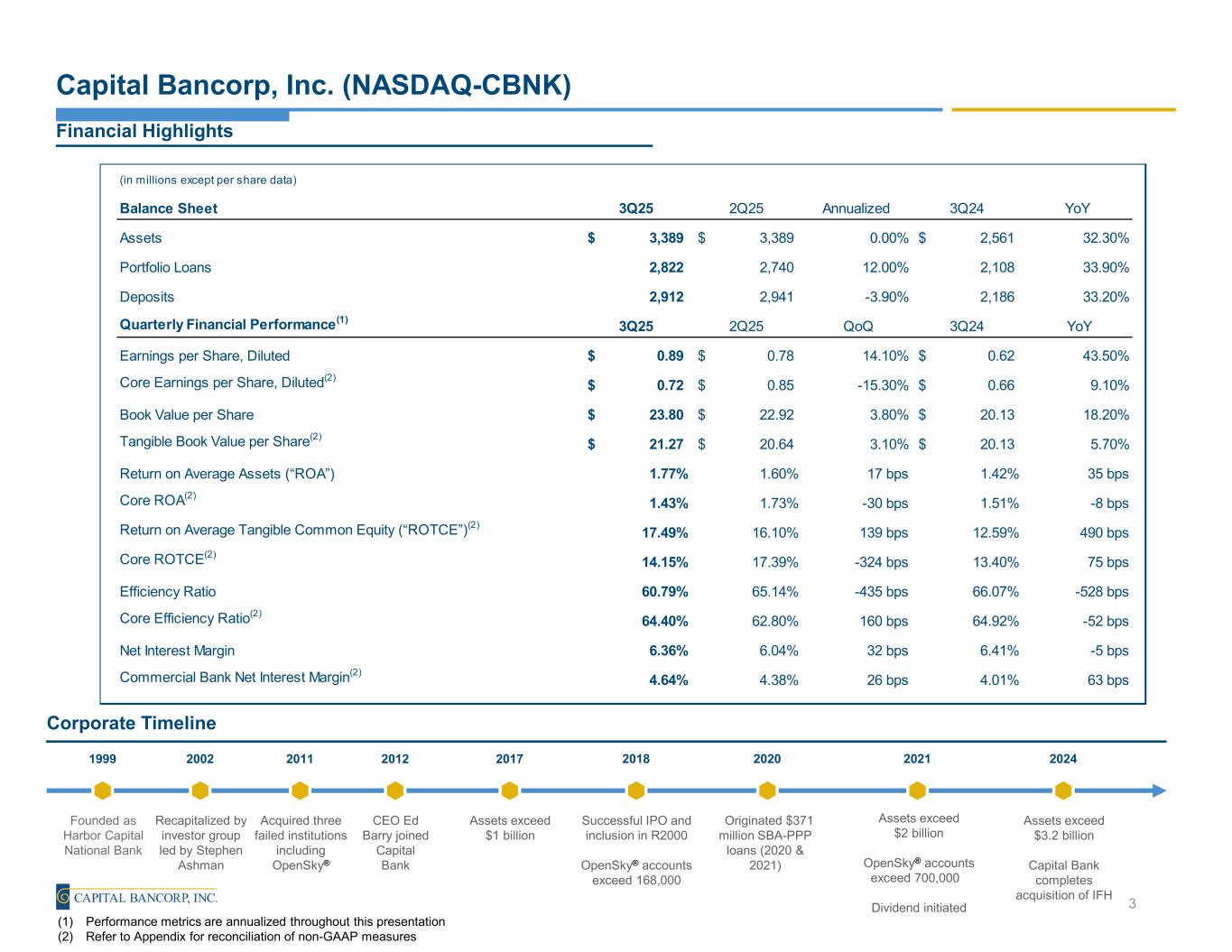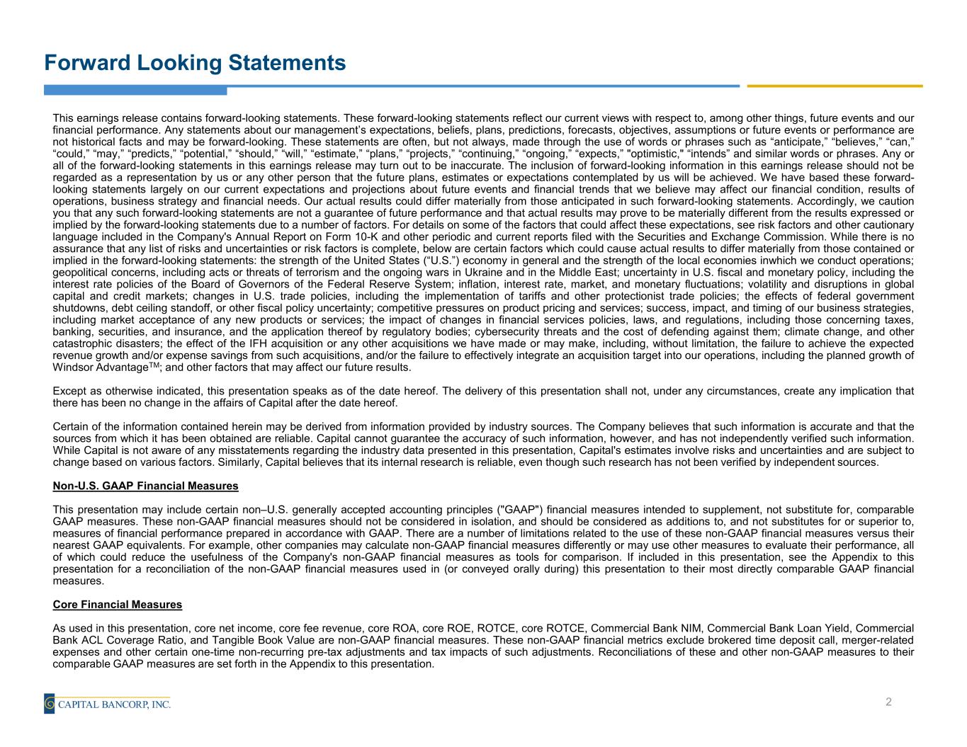 Forward Looking Statements This earnings release contains forward-looking statements. These forward-looking statements reflect our current views with respect to, among other things, future events and our financial performance. Any statements about our management’s expectations, beliefs, plans, predictions, forecasts, objectives, assumptions or future events or performance are not historical facts and may be forward-looking. These statements are often, but not always, made through the use of words or phrases such as “anticipate,” “believes,” “can,” “could,” “may,” “predicts,” “potential,” “should,” “will,” “estimate,” “plans,” “projects,” “continuing,” “ongoing,” “expects,” "optimistic," “intends” and similar words or phrases. Any or all of the forward-looking statements in this earnings release may turn out to be inaccurate. The inclusion of forward-looking information in this earnings release should not be regarded as a representation by us or any other person that the future plans, estimates or expectations contemplated by us will be achieved. We have based these forward- looking statements largely on our current expectations and projections about future events and financial trends that we believe may affect our financial condition, results of operations, business strategy and financial needs. Our actual results could differ materially from those anticipated in such forward-looking statements. Accordingly, we caution you that any such forward-looking statements are not a guarantee of future performance and that actual results may prove to be materially different from the results expressed or implied by the forward-looking statements due to a number of factors. For details on some of the factors that could affect these expectations, see risk factors and other cautionary language included in the Company's Annual Report on Form 10-K and other periodic and current reports filed with the Securities and Exchange Commission. While there is no assurance that any list of risks and uncertainties or risk factors is complete, below are certain factors which could cause actual results to differ materially from those contained or implied in the forward-looking statements: the strength of the United States (“U.S.”) economy in general and the strength of the local economies inwhich we conduct operations; geopolitical concerns, including acts or threats of terrorism and the ongoing wars in Ukraine and in the Middle East; uncertainty in U.S. fiscal and monetary policy, including the interest rate policies of the Board of Governors of the Federal Reserve System; inflation, interest rate, market, and monetary fluctuations; volatility and disruptions in global capital and credit markets; changes in U.S. trade policies, including the implementation of tariffs and other protectionist trade policies; the effects of federal government shutdowns, debt ceiling standoff, or other fiscal policy uncertainty; competitive pressures on product pricing and services; success, impact, and timing of our business strategies, including market acceptance of any new products or services; the impact of changes in financial services policies, laws, and regulations, including those concerning taxes, banking, securities, and insurance, and the application thereof by regulatory bodies; cybersecurity threats and the cost of defending against them; climate change, and other catastrophic disasters; the effect of the IFH acquisition or any other acquisitions we have made or may make, including, without limitation, the failure to achieve the expected revenue growth and/or expense savings from such acquisitions, and/or the failure to effectively integrate an acquisition target into our operations, including the planned growth of Windsor AdvantageTM; and other factors that may affect our future results. Except as otherwise indicated, this presentation speaks as of the date hereof. The delivery of this presentation shall not, under any circumstances, create any implication that there has been no change in the affairs of Capital after the date hereof. Certain of the information contained herein may be derived from information provided by industry sources. The Company believes that such information is accurate and that the sources from which it has been obtained are reliable. Capital cannot guarantee the accuracy of such information, however, and has not independently verified such information. While Capital is not aware of any misstatements regarding the industry data presented in this presentation, Capital's estimates involve risks and uncertainties and are subject to change based on various factors. Similarly, Capital believes that its internal research is reliable, even though such research has not been verified by independent sources. Non-U.S. GAAP Financial Measures This presentation may include certain non–U.S. generally accepted accounting principles ("GAAP") financial measures intended to supplement, not substitute for, comparable GAAP measures. These non-GAAP financial measures should not be considered in isolation, and should be considered as additions to, and not substitutes for or superior to, measures of financial performance prepared in accordance with GAAP. There are a number of limitations related to the use of these non-GAAP financial measures versus their nearest GAAP equivalents. For example, other companies may calculate non-GAAP financial measures differently or may use other measures to evaluate their performance, all of which could reduce the usefulness of the Company's non-GAAP financial measures as tools for comparison. If included in this presentation, see the Appendix to this presentation for a reconciliation of the non-GAAP financial measures used in (or conveyed orally during) this presentation to their most directly comparable GAAP financial measures. Core Financial Measures As used in this presentation, core net income, core fee revenue, 