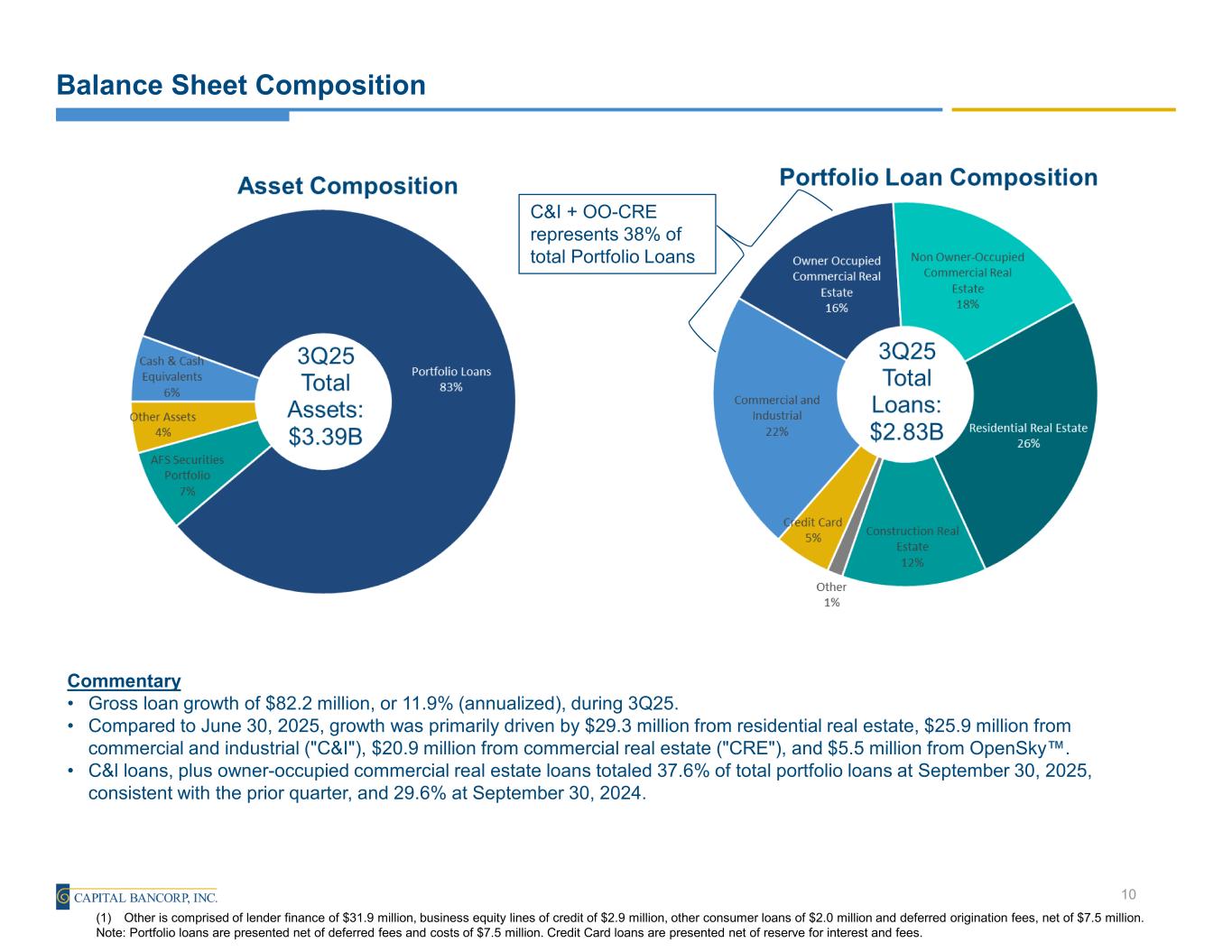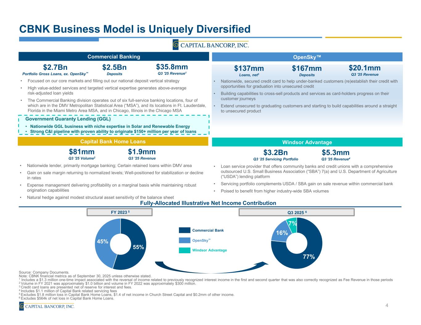 Capital Bancorp, Inc. (NASDAQ-CBNK) Financial Highlights Corporate Timeline Founded as Harbor Capital National Bank Recapitalized by investor group led by Stephen Ashman Acquired three failed institutions including OpenSky® CEO Ed Barry joined Capital Bank Assets exceed $1 billion Successful IPO and inclusion in R2000 OpenSky® accounts exceed 168,000 1999 2002 2011 2012 2017 2018 Originated $371 million SBA-PPP loans (2020 & 2021) 2020 Assets exceed $2 billion OpenSky® accounts exceed 700,000 Dividend initiated 2021 (1) Performance metrics are annualized throughout this presentation (2) Refer to Appendix for reconciliation of non-GAAP measures Assets exceed $3.2 billion Capital Bank completes acquisition of IFH 2024 3 (in millions except per share data) Balance Sheet 3Q25 2Q25 Annualized 3Q24 YoY Assets 3,389$ 3,389$ 0.00% 2,561$ 32.30% Portfolio Loans 2,822 2,740 12.00% 2,108 33.90% Deposits 2,912 2,941 -3.90% 2,186 33.20% Quarterly Financial Performance(1) 3Q25 2Q25  QoQ 3Q24  YoY Earnings per Share, Diluted 0.89$ 0.78$ 14.10% 0.62$ 43.50% Core Earnings per Share, Diluted(2) 0.72$ 0.85$ -15.30% 0.66$ 9.10% Book Value per Share 23.80$ 22.92$ 3.80% 20.13$ 18.20% Tangible Book Value per Share(2) 21.27$ 20.64$ 3.10% 20.13$ 5.70% Return on Average Assets (“ROA”) 1.77% 1.60% 17 bps 1.42% 35 bps Core ROA(2) 1.43% 1.73% -30 bps 1.51% -8 bps Return on Average Tangible Common Equity (“ROTCE”)(2) 17.49% 16.10% 139 bps 12.59% 490 bps Core ROTCE(2) 14.15% 17.39% -324 bps 13.40% 75 bps Efficiency Ratio 60.79% 65.14% -435 bps 66.07% -528 bps Core Efficiency Ratio(2) 64.40% 62.80% 160 bps 64.92% -52 bps Net Interest Margin 6.36% 6.04% 32 bps 6.41% -5 bps Commercial Bank Net Interest Margin(2) 4.64% 4.38% 26 bps 4.01% 63 bps