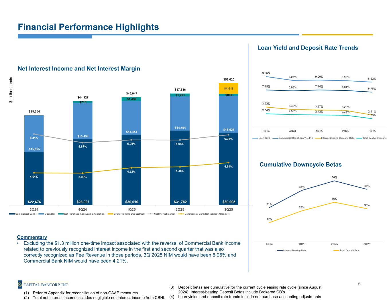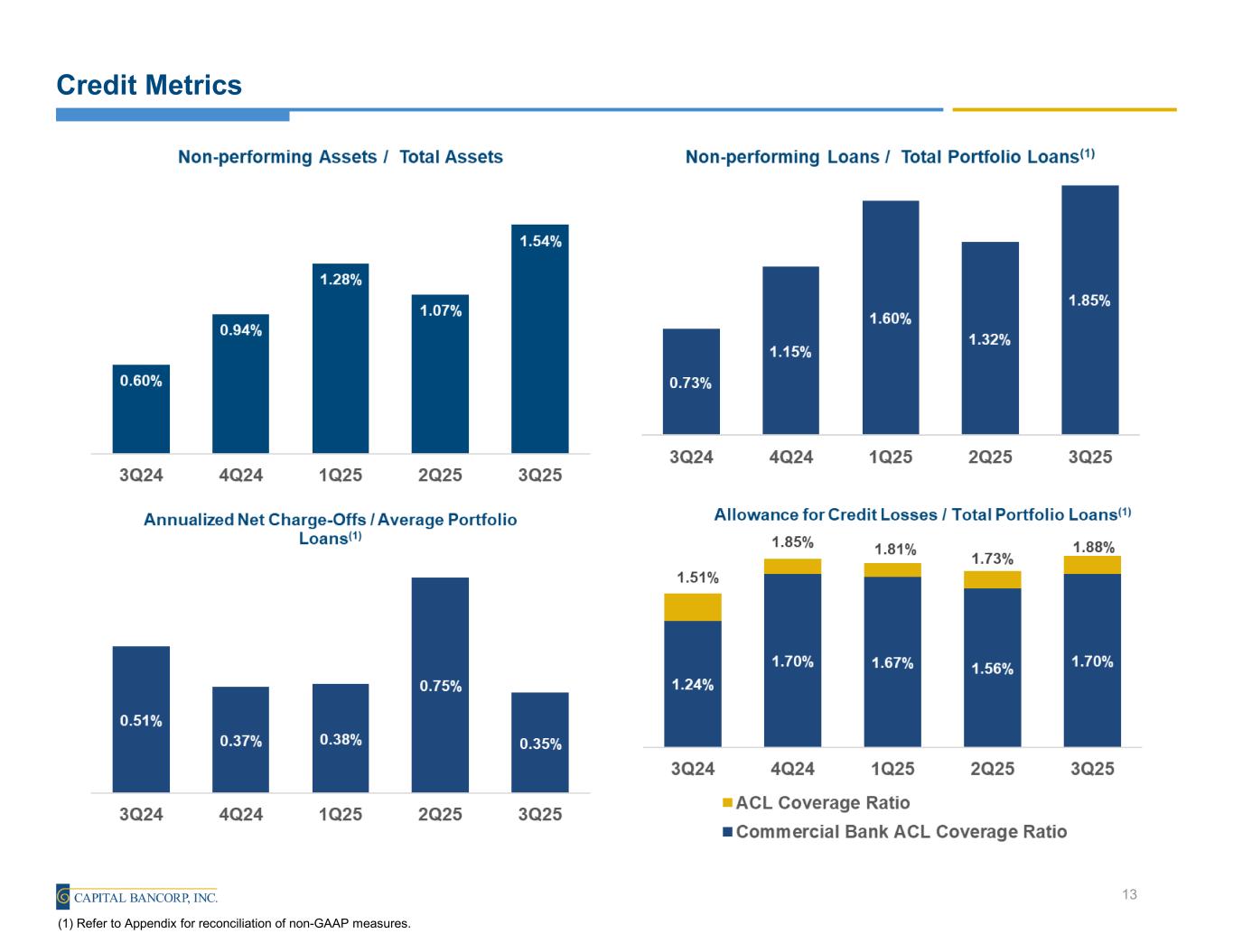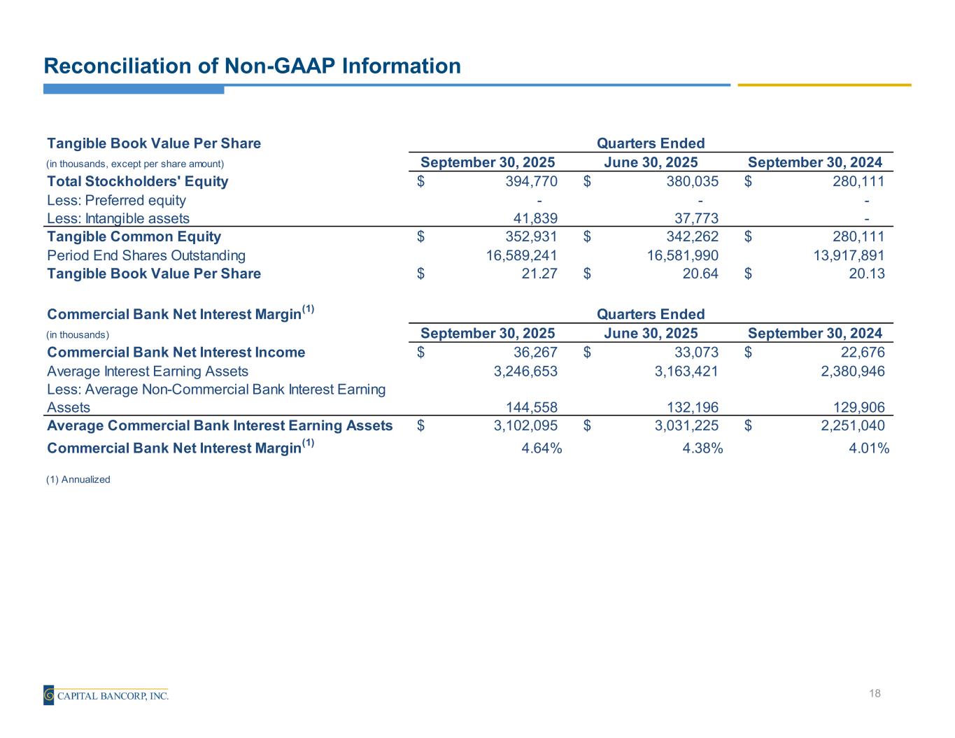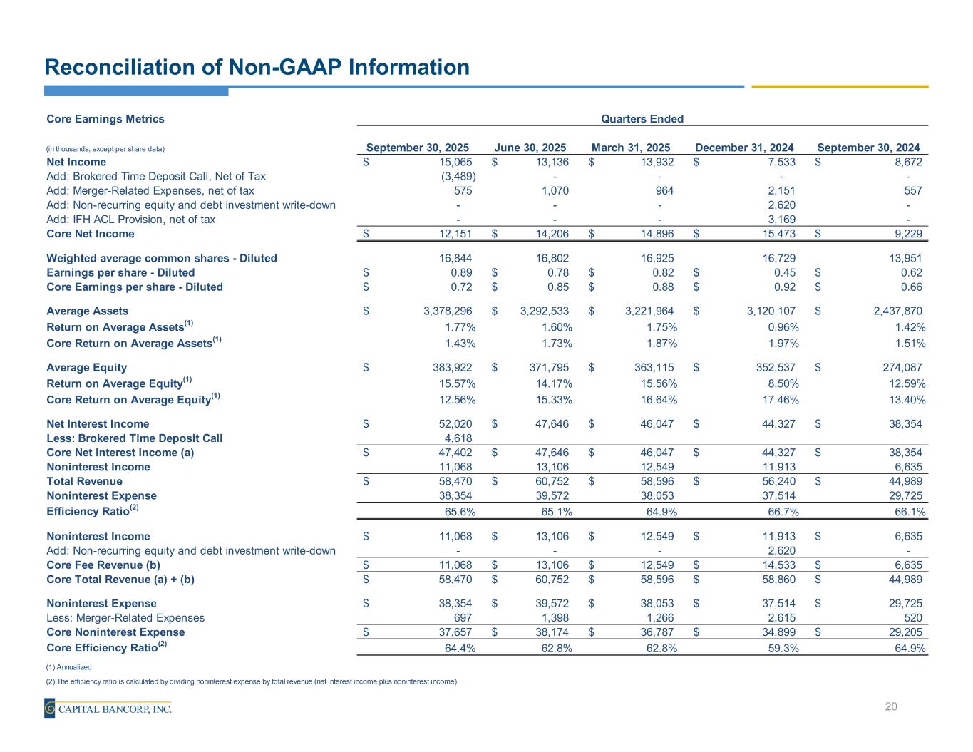 Reconciliation of Non-GAAP Information 19 Net Charge-offs to Average Portfolio Loans(1) (in thousands) September 30, 2025 June 30, 2025 March 31, 2025 December 31, 2024 September 30, 2024 Total Net Charge-offs 5,088$ 5,088$ 2,444$ 2,427$ 2,655$ Total Average Portfolio Loans 2,733,865 2,733,865 2,634,110 2,592,960 2,053,619 Net Charge-offs to Average Portfolio Loans(1) 0.75% 0.75% 0.38% 0.37% 0.51% Nonperforming Loans to Total Portfolio Loans (in thousands) September 30, 2025 June 30, 2025 March 31, 2025 December 31, 2024 September 30, 2024 Total Nonperforming Loans 52,247$ 36,167$ 42,934$ 30,241$ 15,460$ Total Portfolio Loans 2,821,983 2,739,808 2,678,406 2,630,163 2,107,522 Nonperforming Loans to Total Portfolio Loans 1.85% 1.32% 1.60% 1.15% 0.73% Allowance for Credit Losses to Total Portfolio Loans (in thousands) September 30, 2025 June 30, 2025 March 31, 2025 December 31, 2024 September 30, 2024 Allowance for Credit Losses 53,045$ 47,447$ 48,454$ 48,652$ 31,925$ Total Portfolio Loans 2,821,983 2,739,808 2,678,406 2,630,163 2,107,522 Nonperforming Loans to Total Portfolio Loans 1.88% 1.73% 1.81% 1.85% 1.51% Commercial Bank Allowance for Credit Losses to Commercial Bank Portfolio Loans (in thousands) September 30, 2025 June 30, 2025 March 31, 2025 December 31, 2024 September 30, 2024 Allowance for Credit Losses 53,045$ 47,447$ 48,454$ 48,652$ 31,925$ Less: Credit Card Allowance for Credit Losses 7,413 6,762 5,905 6,402 7,339 Commercial Bank Allowance for Credit Losses 45,632 40,685 42,549 42,250 24,586 Total Portfolio Loans 2,821,983 2,739,808 2,678,406 2,630,163 2,107,522 Less: Gross Credit Card Loans 130,897 126,233 115,991 122,928 121,718 Commercial Bank Portfolio Loans 2,691,086 2,613,575 2,562,415 2,507,235 1,985,804 Commercial Bank Allowance for Credit Losses to Commercial Bank Portfolio Loans 1.70% 1.56% 1.67% 1.70% 1.24% (1) Annualized Quarters Ended Quarters Ended Quarters Ended Quarters Ended