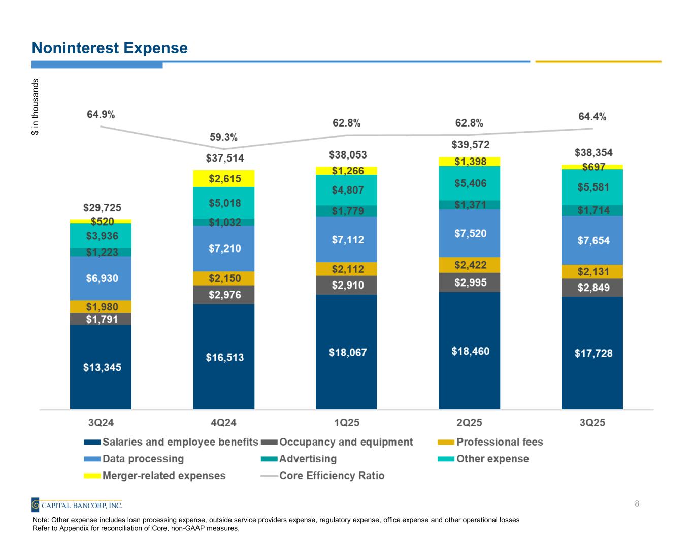 Noninterest Expense $ in th ou sa nd s 8 Note: Other expense includes loan processing expense, outside service providers expense, regulatory expense, office expense and other operational losses Refer to Appendix for reconciliation of Core, non-GAAP measures.