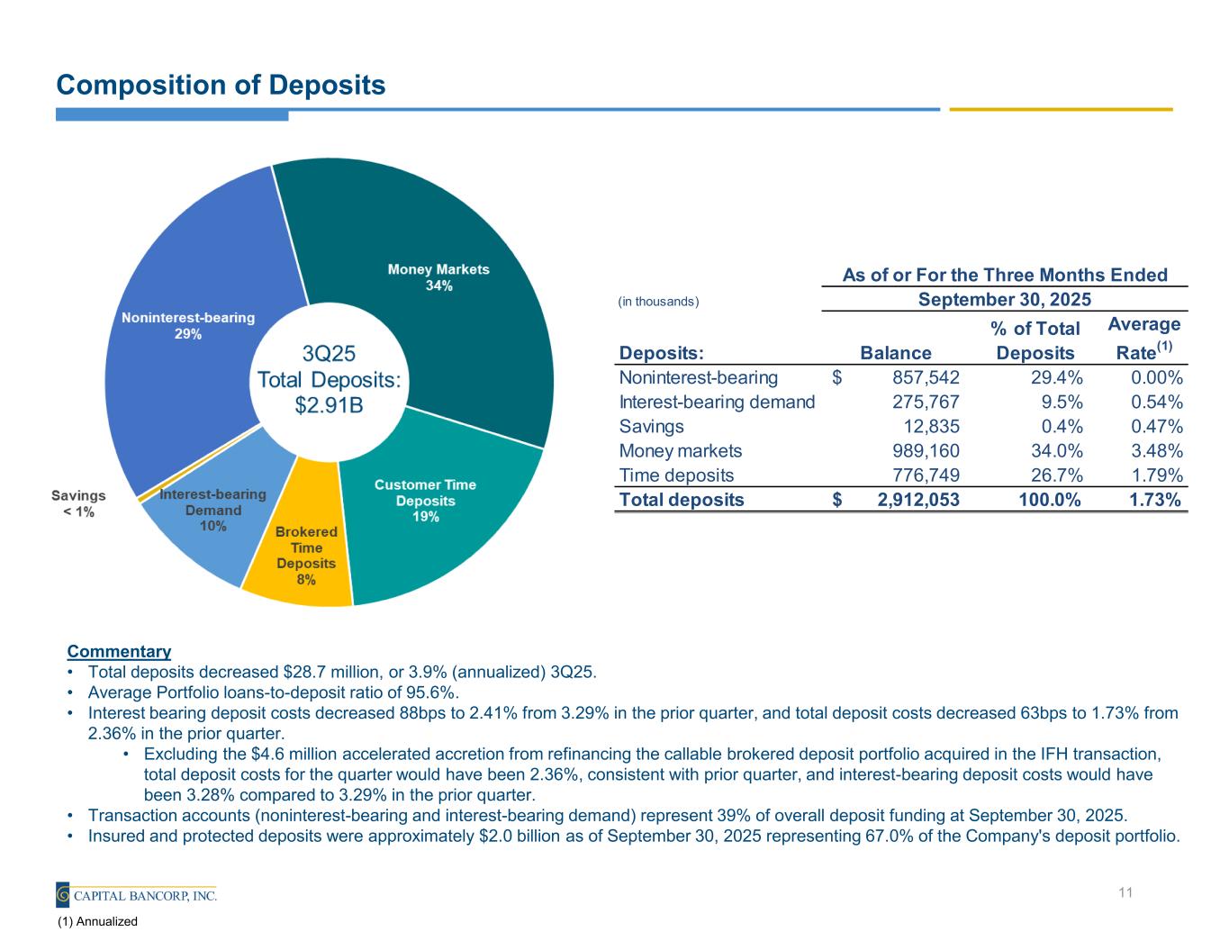 Balance Sheet Composition Commentary • Gross loan growth of $82.2 million, or 11.9% (annualized), during 3Q25. • Compared to June 30, 2025, growth was primarily driven by $29.3 million from residential real estate, $25.9 million from commercial and industrial ("C&I"), $20.9 million from commercial real estate ("CRE"), and $5.5 million from OpenSky . • C&l loans, plus owner-occupied commercial real estate loans totaled 37.6% of total portfolio loans at September 30, 2025, consistent with the prior quarter, and 29.6% at September 30, 2024. 10 (1) Other is comprised of lender finance of $31.9 million, business equity lines of credit of $2.9 million, other consumer loans of $2.0 million and deferred origination fees, net of $7.5 million. Note: Portfolio loans are presented net of deferred fees and costs of $7.5 million. Credit Card loans are presented net of reserve for interest and fees. C&I + OO-CRE represents 38% of total Portfolio Loans
