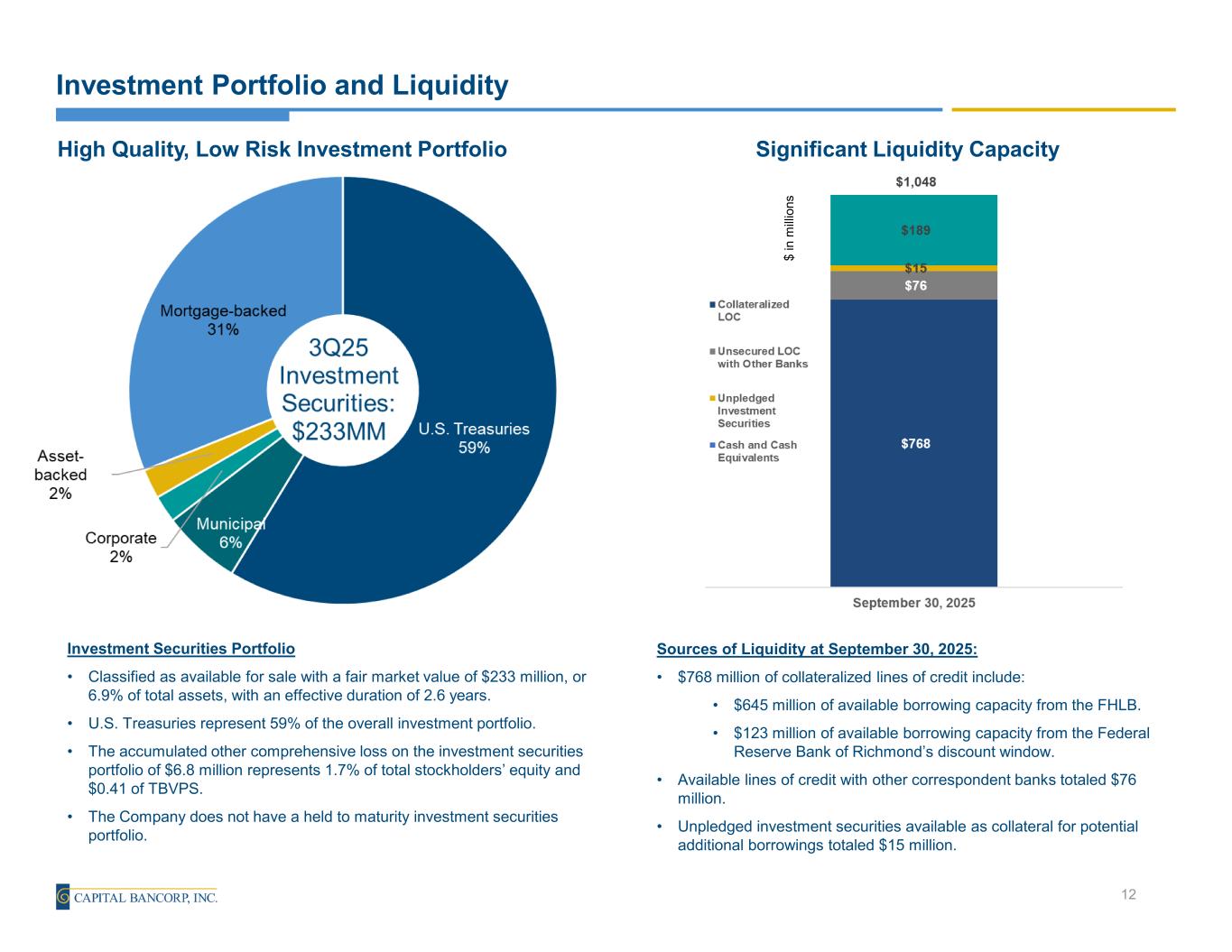 Composition of Deposits Commentary • Total deposits decreased $28.7 million, or 3.9% (annualized) 3Q25. • Average Portfolio loans-to-deposit ratio of 95.6%. • Interest bearing deposit costs decreased 88bps to 2.41% from 3.29% in the prior quarter, and total deposit costs decreased 63bps to 1.73% from 2.36% in the prior quarter. • Excluding the $4.6 million accelerated accretion from refinancing the callable brokered deposit portfolio acquired in the IFH transaction, total deposit costs for the quarter would have been 2.36%, consistent with prior quarter, and interest-bearing deposit costs would have been 3.28% compared to 3.29% in the prior quarter. • Transaction accounts (noninterest-bearing and interest-bearing demand) represent 39% of overall deposit funding at September 30, 2025. • Insured and protected deposits were approximately $2.0 billion as of September 30, 2025 representing 67.0% of the Company's deposit portfolio. 11 (1) Annualized (in thousands) Deposits: Balance % of Total Deposits Average Rate(1) Noninterest-bearing 857,542$ 29.4% 0.00% Interest-bearing demand 275,767 9.5% 0.54% Savings 12,835 0.4% 0.47% Money markets 989,160 34.0% 3.48% Time deposits 776,749 26.7% 1.79% Total deposits 2,912,053$ 100.0% 1.73% As of or For the Three Months Ended September 30, 2025