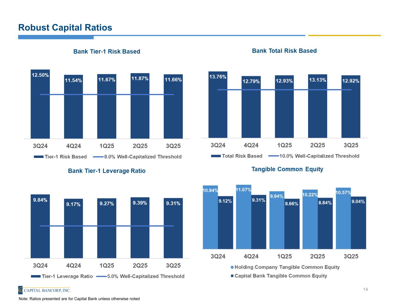 Robust Capital Ratios 14 Note: Ratios presented are for Capital Bank unless otherwise noted