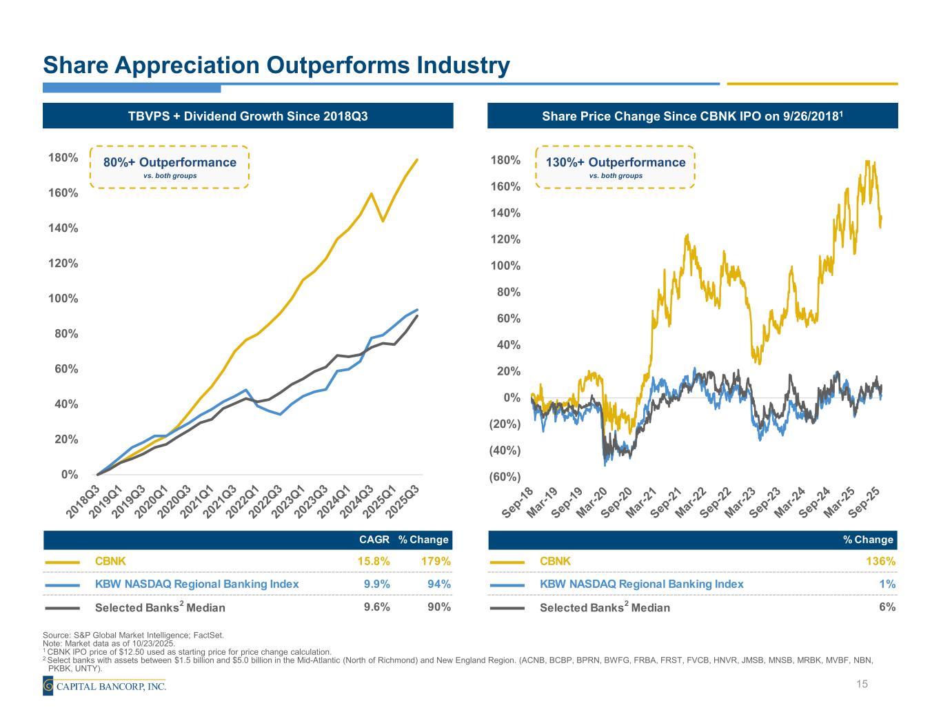 % Change CBNK 136% KBW NASDAQ Regional Banking Index 1% Selected Banks2 Median 6% 58.48% (60%) (40%) (20%) 0% 20% 40% 60% 80% 100% 120% 140% 160% 180% Share Appreciation Outperforms Industry Source: S&P Global Market Intelligence; FactSet. Note: Market data as of 10/23/2025. 1 CBNK IPO price of $12.50 used as starting price for price change calculation. 2 Select banks with assets between $1.5 billion and $5.0 billion in the Mid-Atlantic (North of Richmond) and New England Region. (ACNB, BCBP, BPRN, BWFG, FRBA, FRST, FVCB, HNVR, JMSB, MNSB, MRBK, MVBF, NBN, PKBK, UNTY). 15 Share Price Change Since CBNK IPO on 9/26/20181TBVPS + Dividend Growth Since 2018Q3 80%+ Outperformance vs. both groups 130%+ Outperformance vs. both groups CAGR % Change CBNK 15.8% 179% KBW NASDAQ Regional Banking Index 9.9% 94% Selected Banks2 Median 9.6% 90% 0% 20% 40% 60% 80% 100% 120% 140% 160% 180%