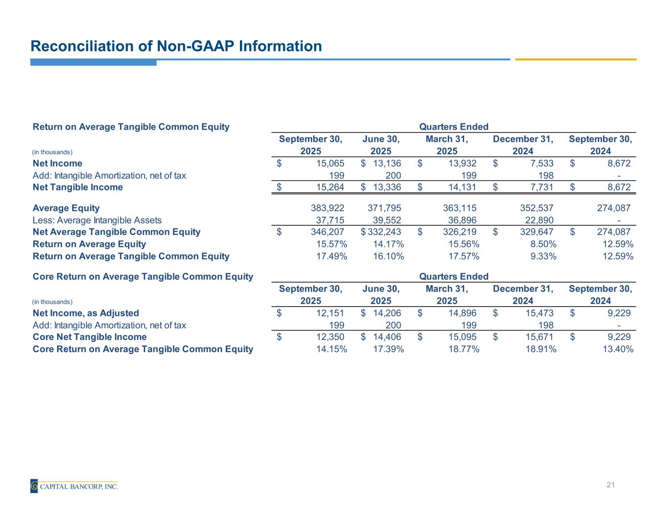 Reconciliation of Non-GAAP Information 20 Core Earnings Metrics (in thousands, except per share data) September 30, 2025 June 30, 2025 March 31, 2025 December 31, 2024 September 30, 2024 Net Income 15,065$ 13,136$ 13,932$ 7,533$ 8,672$ Add: Brokered Time Deposit Call, Net of Tax (3,489) - - - - Add: Merger-Related Expenses, net of tax 575 1,070 964 2,151 557 Add: Non-recurring equity and debt investment write-down - - - 2,620 - Add: IFH ACL Provision, net of tax - - - 3,169 - Core Net Income 12,151$ 14,206$ 14,896$ 15,473$ 9,229$ Weighted average common shares - Diluted 16,844 16,802 16,925 16,729 13,951 Earnings per share - Diluted 0.89$ 0.78$ 0.82$ 0.45$ 0.62$ Core Earnings per share - Diluted 0.72$ 0.85$ 0.88$ 0.92$ 0.66$ Average Assets 3,378,296$ 3,292,533$ 3,221,964$ 3,120,107$ 2,437,870$ Return on Average Assets(1) 1.77% 1.60% 1.75% 0.96% 1.42% Core Return on Average Assets(1) 1.43% 1.73% 1.87% 1.97% 1.51% Average Equity 383,922$ 371,795$ 363,115$ 352,537$ 274,087$ Return on Average Equity(1) 15.57% 14.17% 15.56% 8.50% 12.59% Core Return on Average Equity(1) 12.56% 15.33% 16.64% 17.46% 13.40% Net Interest Income 52,020$ 47,646$ 46,047$ 44,327$ 38,354$ Less: Brokered Time Deposit Call 4,618 Core Net Interest Income (a) 47,402$ 47,646$ 46,047$ 44,327$ 38,354$ Noninterest Income 11,068 13,106 12,549 11,913 6,635 Total Revenue 58,470$ 60,752$ 58,596$ 56,240$ 44,989$ Noninterest Expense 38,354 39,572 38,053 37,514 29,725 Efficiency Ratio(2) 65.6% 65.1% 64.9% 66.7% 66.1% Noninterest Income 11,068$ 13,106$ 12,549$ 11,913$ 6,635$ Add: Non-recurring equity and debt investment write-down - - - 2,620 - Core Fee Revenue (b) 11,068$ 13,106$ 12,549$ 14,533$ 6,635$ Core Total Revenue (a) + (b) 58,470$ 60,752$ 58,596$ 58,860$ 44,989$ Noninterest Expense 38,354$ 39,572$ 38,053$ 37,514$ 29,725$ Less: Merger-Related Expenses 697 1,398 1,266 2,615 520 Core Noninterest Expense 37,657$ 38,174$ 36,787$ 34,899$ 29,205$ Core Efficiency Ratio(2) 64.4% 62.8% 62.8% 59.3% 64.9% (1) Annualized (2) The efficiency ratio is calculated by dividing noninterest expense by total revenue (net interest income plus noninterest income). Quarters Ended