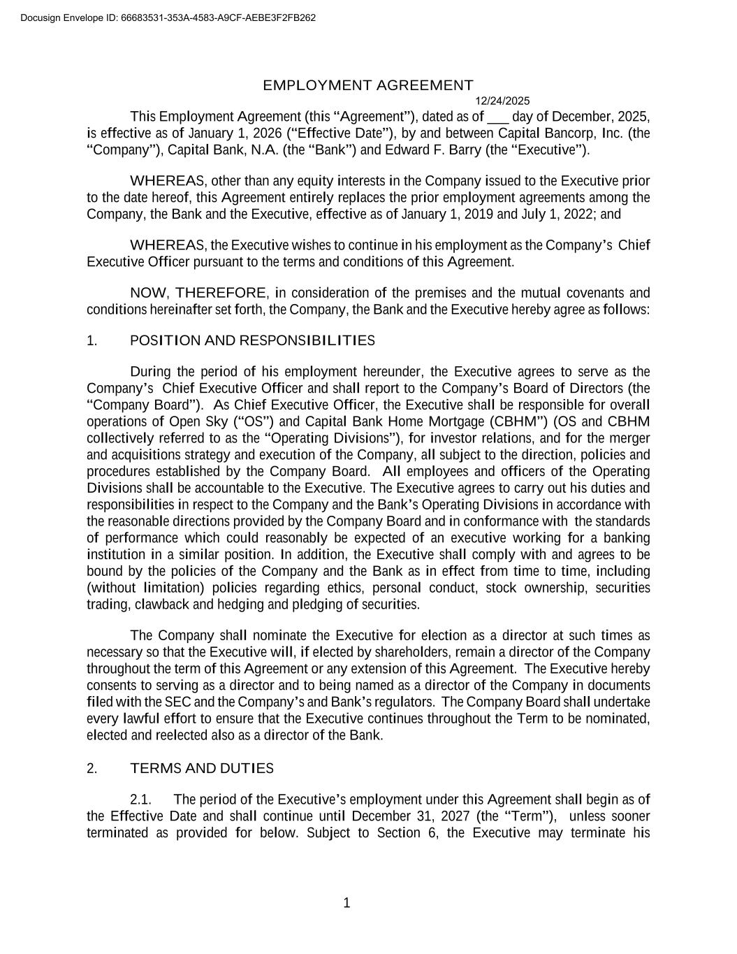 1 EMPLOYMENT AGREEMENT This Employment Agreement (this “Agreement”), dated as of ___ day of December, 2025, is effective as of January 1, 2026 (“Effective Date”), by and between Capital Bancorp, Inc. (the “Company”), Capital Bank, N.A. (the “Bank”) and Edward F. Barry (the “Executive”). WHEREAS, other than any equity interests in the Company issued to the Executive prior to the date hereof, this Agreement entirely replaces the prior employment agreements among the Company, the Bank and the Executive, effective as of January 1, 2019 and July 1, 2022; and WHEREAS, the Executive wishes to continue in his employment as the Company’s Chief Executive Officer pursuant to the terms and conditions of this Agreement. NOW, THEREFORE, in consideration of the premises and the mutual covenants and conditions hereinafter set forth, the Company, the Bank and the Executive hereby agree as follows: 1. POSITION AND RESPONSIBILITIES During the period of his employment hereunder, the Executive agrees to serve as the Company’s Chief Executive Officer and shall report to the Company’s Board of Directors (the “Company Board”). As Chief Executive Officer, the Executive shall be responsible for overall operations of Open Sky (“OS”) and Capital Bank Home Mortgage (CBHM”) (OS and CBHM collectively referred to as the “Operating Divisions”), for investor relations, and for the merger and acquisitions strategy and execution of the Company, all subject to the direction, policies and procedures established by the Company Board. All employees and officers of the Operating Divisions shall be accountable to the Executive. The Executive agrees to carry out his duties and responsibilities in respect to the Company and the Bank’s Operating Divisions in accordance with the reasonable directions provided by the Company Board and in conformance with the standards of performance which could reasonably be expected of an executive working for a banking institution in a similar position. In addition, the Executive shall comply with and agrees to be bound by the policies of the Company and the Bank as in effect from time to time, including (without limitation) policies regarding ethics, personal conduct, stock ownership, securities trading, clawback and hedging and pledging of securities. The Company shall nominate the Executive for election as a director at such times as necessary so that the Executive will, if elected by shareholders, remain a director of the Company throughout the term of this Agreement or any extension of this Agreement. The Executive hereby consents to serving as a director and to being named as a director of the Company in documents filed with the SEC and the Company’s and Bank’s regulators. The Company Board shall undertake every lawful effort to ensure that the Executive continues throughout the Term to be nominated, elected and reelected also as a director of the Bank. 2. TERMS AND DUTIES 2.1. The period of the Executive’s employment under this Agreement shall begin as of the Effective Date and shall continue until December 31, 2027 (the “Term”), unless sooner terminated as provided for below. Subject to Section 6, the Executive may terminate his Docusign Envelope ID: 66683531-353A-4583-A9CF-AEBE3F2FB262 12/24/2025