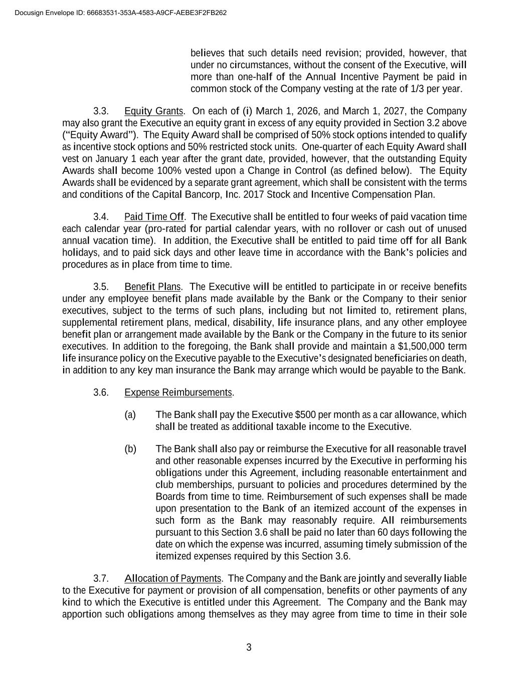 3 believes that such details need revision; provided, however, that under no circumstances, without the consent of the Executive, will more than one-half of the Annual Incentive Payment be paid in common stock of the Company vesting at the rate of 1/3 per year. 3.3. Equity Grants. On each of (i) March 1, 2026, and March 1, 2027, the Company may also grant the Executive an equity grant in excess of any equity provided in Section 3.2 above (“Equity Award”). The Equity Award shall be comprised of 50% stock options intended to qualify as incentive stock options and 50% restricted stock units. One-quarter of each Equity Award shall vest on January 1 each year after the grant date, provided, however, that the outstanding Equity Awards shall become 100% vested upon a Change in Control (as defined below). The Equity Awards shall be evidenced by a separate grant agreement, which shall be consistent with the terms and conditions of the Capital Bancorp, Inc. 2017 Stock and Incentive Compensation Plan. 3.4. Paid Time Off. The Executive shall be entitled to four weeks of paid vacation time each calendar year (pro-rated for partial calendar years, with no rollover or cash out of unused annual vacation time). In addition, the Executive shall be entitled to paid time off for all Bank holidays, and to paid sick days and other leave time in accordance with the Bank’s policies and procedures as in place from time to time. 3.5. Benefit Plans. The Executive will be entitled to participate in or receive benefits under any employee benefit plans made available by the Bank or the Company to their senior executives, subject to the terms of such plans, including but not limited to, retirement plans, supplemental retirement plans, medical, disability, life insurance plans, and any other employee benefit plan or arrangement made available by the Bank or the Company in the future to its senior executives. In addition to the foregoing, the Bank shall provide and maintain a $1,500,000 term life insurance policy on the Executive payable to the Executive’s designated beneficiaries on death, in addition to any key man insurance the Bank may arrange which would be payable to the Bank. 3.6. Expense Reimbursements. (a) The Bank shall pay the Executive $500 per month as a car allowance, which shall be treated as additional taxable income to the Executive. (b) The Bank shall also pay or reimburse the Executive for all reasonable travel and other reasonable expenses incurred by the Executive in performing his obligations under this Agreement, including reasonable entertainment and club memberships, pursuant to policies and procedures determined by the Boards from time to time. Reimbursement of such expenses shall be made upon presentation to the Bank of an itemized account of the expenses in such form as the Bank may reasonably require. All reimbursements pursuant to this Section 3.6 shall be paid no later than 60 days following the date on which the expense was incurred, assuming timely submission of the itemized expenses required by this Section 3.6. 3.7. Allocation of Payments. The Company and the Bank are jointly and severally liable to the Executive for payment or provision of all compensation, benefits or other payments of any kind to which the Executive is entitled under this Agreement. The Company and the Bank may apportion such obligations among themselves as they may agree from time to time in their sole Docusign Envelope ID: 66683531-353A-4583-A9CF-AEBE3F2FB262