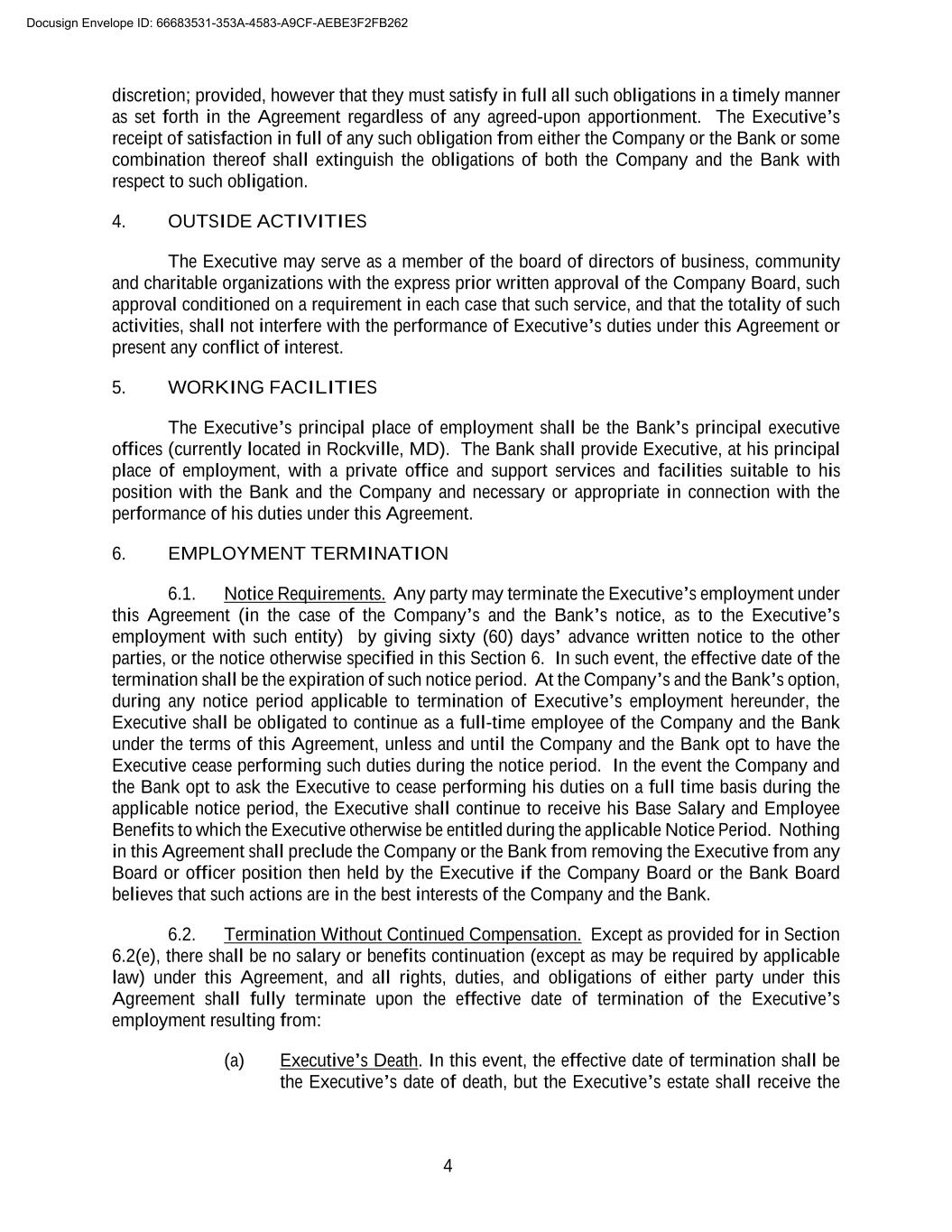 4 discretion; provided, however that they must satisfy in full all such obligations in a timely manner as set forth in the Agreement regardless of any agreed-upon apportionment. The Executive’s receipt of satisfaction in full of any such obligation from either the Company or the Bank or some combination thereof shall extinguish the obligations of both the Company and the Bank with respect to such obligation. 4. OUTSIDE ACTIVITIES The Executive may serve as a member of the board of directors of business, community and charitable organizations with the express prior written approval of the Company Board, such approval conditioned on a requirement in each case that such service, and that the totality of such activities, shall not interfere with the performance of Executive’s duties under this Agreement or present any conflict of interest. 5. WORKING FACILITIES The Executive’s principal place of employment shall be the Bank’s principal executive offices (currently located in Rockville, MD). The Bank shall provide Executive, at his principal place of employment, with a private office and support services and facilities suitable to his position with the Bank and the Company and necessary or appropriate in connection with the performance of his duties under this Agreement. 6. EMPLOYMENT TERMINATION 6.1. Notice Requirements. Any party may terminate the Executive’s employment under this Agreement (in the case of the Company’s and the Bank’s notice, as to the Executive’s employment with such entity) by giving sixty (60) days’ advance written notice to the other parties, or the notice otherwise specified in this Section 6. In such event, the effective date of the termination shall be the expiration of such notice period. At the Company’s and the Bank’s option, during any notice period applicable to termination of Executive’s employment hereunder, the Executive shall be obligated to continue as a full-time employee of the Company and the Bank under the terms of this Agreement, unless and until the Company and the Bank opt to have the Executive cease performing such duties during the notice period. In the event the Company and the Bank opt to ask the Executive to cease performing his duties on a full time basis during the applicable notice period, the Executive shall continue to receive his Base Salary and Employee Benefits to which the Executive otherwise be entitled during the applicable Notice Period. Nothing in this Agreement shall preclude the Company or the Bank from removing the Executive from any Board or officer position then held by the Executive if the Company Board or the Bank Board believes that such actions are in the best interests of the Company and the Bank. 6.2. Termination Without Continued Compensation. Except as provided for in Section 6.2(e), there shall be no salary or benefits continuation (except as may be required by applicable law) under this Agreement, and all rights, duties, and obligations of either party under this Agreement shall fully terminate upon the effective date of termination of the Executive’s employment resulting from: (a) Executive’s Death. In this event, the effective date of termination shall be the Executive’s date of death, but the Executive’s estate shall receive the Docusign Envelope ID: 66683531-353A-4583-A9CF-AEBE3F2FB262