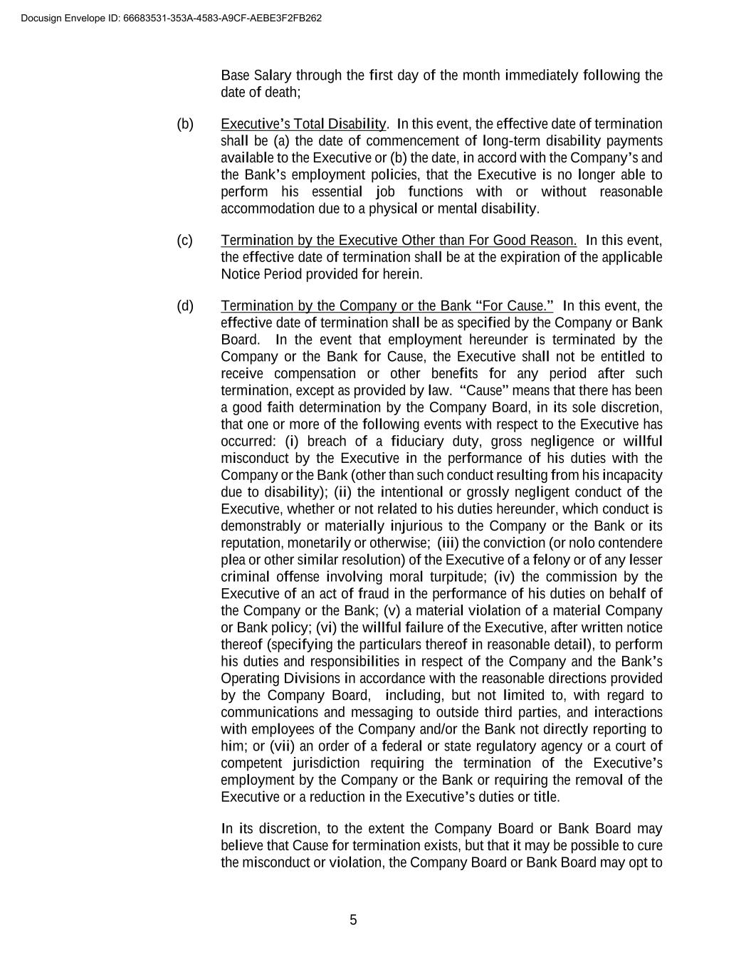 5 Base Salary through the first day of the month immediately following the date of death; (b) Executive’s Total Disability. In this event, the effective date of termination shall be (a) the date of commencement of long-term disability payments available to the Executive or (b) the date, in accord with the Company’s and the Bank’s employment policies, that the Executive is no longer able to perform his essential job functions with or without reasonable accommodation due to a physical or mental disability. (c) Termination by the Executive Other than For Good Reason. In this event, the effective date of termination shall be at the expiration of the applicable Notice Period provided for herein. (d) Termination by the Company or the Bank “For Cause.” In this event, the effective date of termination shall be as specified by the Company or Bank Board. In the event that employment hereunder is terminated by the Company or the Bank for Cause, the Executive shall not be entitled to receive compensation or other benefits for any period after such termination, except as provided by law. “Cause” means that there has been a good faith determination by the Company Board, in its sole discretion, that one or more of the following events with respect to the Executive has occurred: (i) breach of a fiduciary duty, gross negligence or willful misconduct by the Executive in the performance of his duties with the Company or the Bank (other than such conduct resulting from his incapacity due to disability); (ii) the intentional or grossly negligent conduct of the Executive, whether or not related to his duties hereunder, which conduct is demonstrably or materially injurious to the Company or the Bank or its reputation, monetarily or otherwise; (iii) the conviction (or nolo contendere plea or other similar resolution) of the Executive of a felony or of any lesser criminal offense involving moral turpitude; (iv) the commission by the Executive of an act of fraud in the performance of his duties on behalf of the Company or the Bank; (v) a material violation of a material Company or Bank policy; (vi) the willful failure of the Executive, after written notice thereof (specifying the particulars thereof in reasonable detail), to perform his duties and responsibilities in respect of the Company and the Bank’s Operating Divisions in accordance with the reasonable directions provided by the Company Board, including, but not limited to, with regard to communications and messaging to outside third parties, and interactions with employees of the Company and/or the Bank not directly reporting to him; or (vii) an order of a federal or state regulatory agency or a court of competent jurisdiction requiring the termination of the Executive’s employment by the Company or the Bank or requiring the removal of the Executive or a reduction in the Executive’s duties or title. In its discretion, to the extent the Company Board or Bank Board may believe that Cause for termination exists, but that it may be possible to cure the misconduct or violation, the Company Board or Bank Board may opt to Docusign Envelope ID: 66683531-353A-4583-A9CF-AEBE3F2FB262
