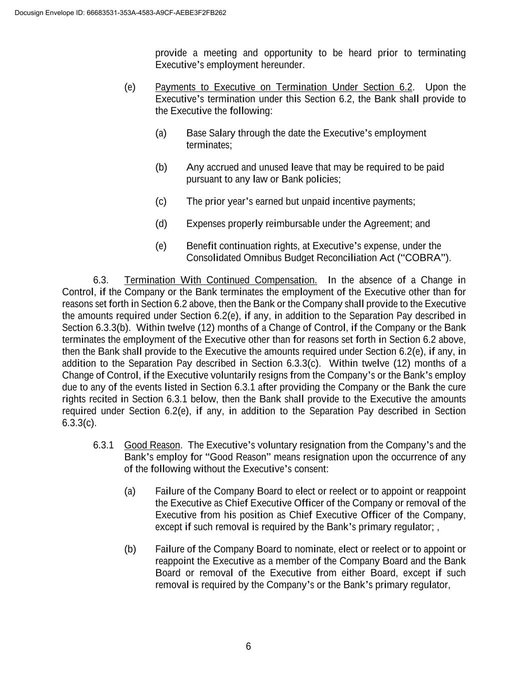 6 provide a meeting and opportunity to be heard prior to terminating Executive’s employment hereunder. (e) Payments to Executive on Termination Under Section 6.2. Upon the Executive’s termination under this Section 6.2, the Bank shall provide to the Executive the following: (a) Base Salary through the date the Executive’s employment terminates; (b) Any accrued and unused leave that may be required to be paid pursuant to any law or Bank policies; (c) The prior year’s earned but unpaid incentive payments; (d) Expenses properly reimbursable under the Agreement; and (e) Benefit continuation rights, at Executive’s expense, under the Consolidated Omnibus Budget Reconciliation Act (“COBRA”). 6.3. Termination With Continued Compensation. In the absence of a Change in Control, if the Company or the Bank terminates the employment of the Executive other than for reasons set forth in Section 6.2 above, then the Bank or the Company shall provide to the Executive the amounts required under Section 6.2(e), if any, in addition to the Separation Pay described in Section 6.3.3(b). Within twelve (12) months of a Change of Control, if the Company or the Bank terminates the employment of the Executive other than for reasons set forth in Section 6.2 above, then the Bank shall provide to the Executive the amounts required under Section 6.2(e), if any, in addition to the Separation Pay described in Section 6.3.3(c). Within twelve (12) months of a Change of Control, if the Executive voluntarily resigns from the Company’s or the Bank’s employ due to any of the events listed in Section 6.3.1 after providing the Company or the Bank the cure rights recited in Section 6.3.1 below, then the Bank shall provide to the Executive the amounts required under Section 6.2(e), if any, in addition to the Separation Pay described in Section 6.3.3(c). 6.3.1 Good Reason. The Executive’s voluntary resignation from the Company’s and the Bank’s employ for “Good Reason” means resignation upon the occurrence of any of the following without the Executive’s consent: (a) Failure of the Company Board to elect or reelect or to appoint or reappoint the Executive as Chief Executive Officer of the Company or removal of the Executive from his position as Chief Executive Officer of the Company, except if such removal is required by the Bank’s primary regulator; , (b) Failure of the Company Board to nominate, elect or reelect or to appoint or reappoint the Executive as a member of the Company Board and the Bank Board or removal of the Executive from either Board, except if such removal is required by the Company’s or the Bank’s primary regulator, Docusign Envelope ID: 66683531-353A-4583-A9CF-AEBE3F2FB262